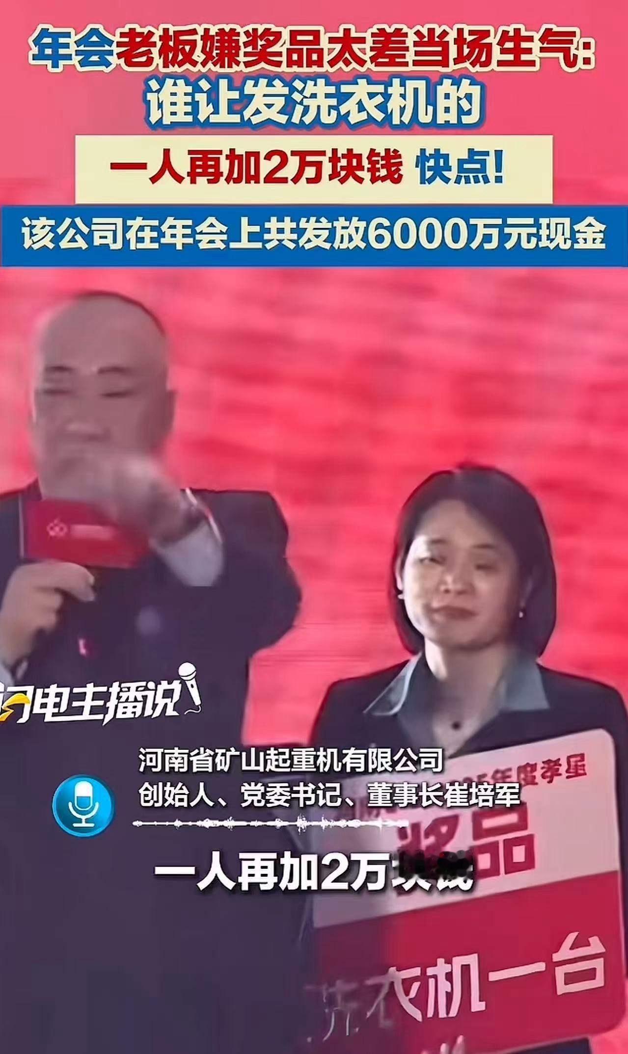 “这样的老板哪里找?”年会现场,这句话刷爆了朋友圈。 当财务部门递上那批洗衣机作为年终奖品时,崔董的脸色瞬间阴沉下来。他毫不掩饰自己的不满,怒吼道:“谁让发洗衣机的?太掉档次了!每人再加两万块钱!”现场一片哗然,员工们既惊讶又感动,纷纷感叹:“这才是真正懂得管理的老板!” 有人说,发洗衣机是“实用派”,但在崔董看来,员工的心远比物质更值钱。年会奖品不是简单的礼物,而是一种态度,一种尊重。洗衣机?那是“家电”的象征,暗示着员工“洗洗睡”,远远不够表达公司对大家一年来辛勤付出的认可。崔董明白,钱花在人心上,回报是十倍百倍。 这不仅仅是一次简单的加薪,更是一次“筑心”行动。老板用行动告诉员工:“你们的价值,我看见了;你们的付出,我珍惜了。”这份诚意,比任何奖品都更有重量。 网友们看后纷纷点赞:“崔董不是在撒钱,是在筑心!”“这样的老板,哪怕加班再累也愿意拼命干!”“钱花得值,员工心服口服!”这句话背后,是对企业文化的深刻洞察,也是对员工情感的精准把握。 其实,很多老板都忽略了这一点:员工的归属感和尊重感,是激发潜能的最大动力。崔董的做法告诉我们,管理不是冷冰冰的数字游戏,而是热乎乎的人心工程。 年会结束后,员工们纷纷表示,明年一定要拼命干,不是为了那两万块,而是为了这份被看见的尊重和信任。谁说钱不能买到忠诚?只要花得对,钱就是最有力的“情感投资”。 这背后,折射出的是一个企业的温度和未来的希望。崔董的举动,或许就是新时代企业管理的“金钥匙”——懂得用心,赢得人心。 你有没有遇到过这样的老板?或者,你又是怎样看待“钱花在人心上”的管理哲学?欢迎留言分享你的故事,让我们一起聊聊那些让人又爱又恨的职场真相!起重集团崔老板