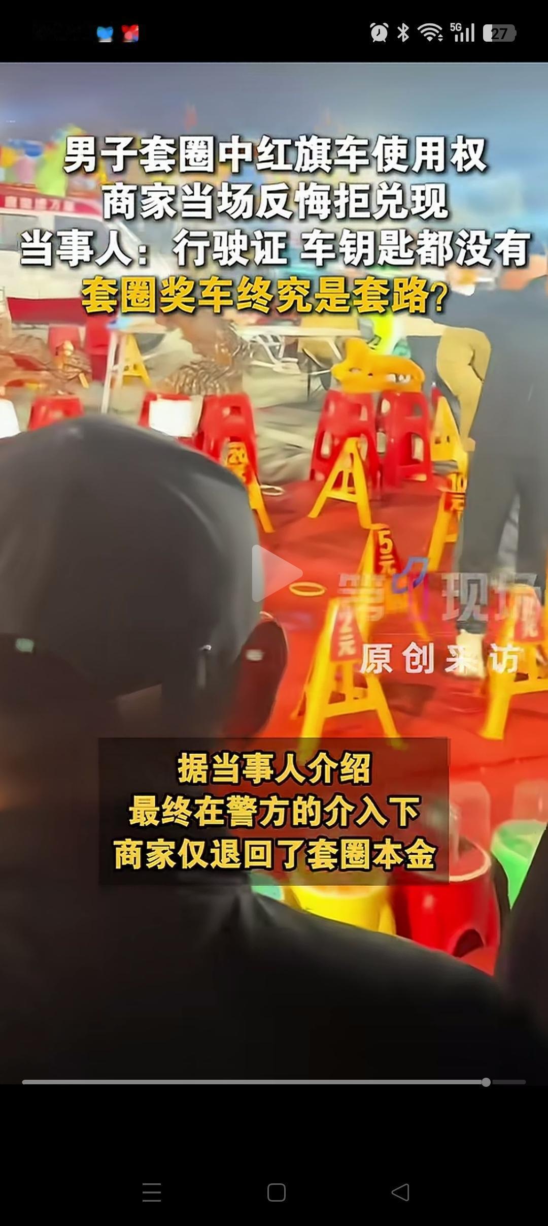 “这是玩不起了?”,山东济宁,一男子花5600块钱套圈中红旗车使用权。不料商家耍赖,一会说车不是自己的,一会说没有车钥匙,连他套圈花的现金都不想退。 直到男子叫来了帽子叔叔,对方才服软。当然也只是退还了套圈的本金,并没有其它的处罚。 这就有点不公平了,本身规则说的很清楚,套中了3次就可以免费开2面。现在套中了,你耍赖,还只需要退回本金,哪里有这么好的事。 那以前别人花钱套的圈不是白套了?反正你也没打算给。 对这样不诚信的商家,应该给予严惩,绝不只是退还套圈的钱这么简单。 要不然这WeiFa的成本也太低了。。