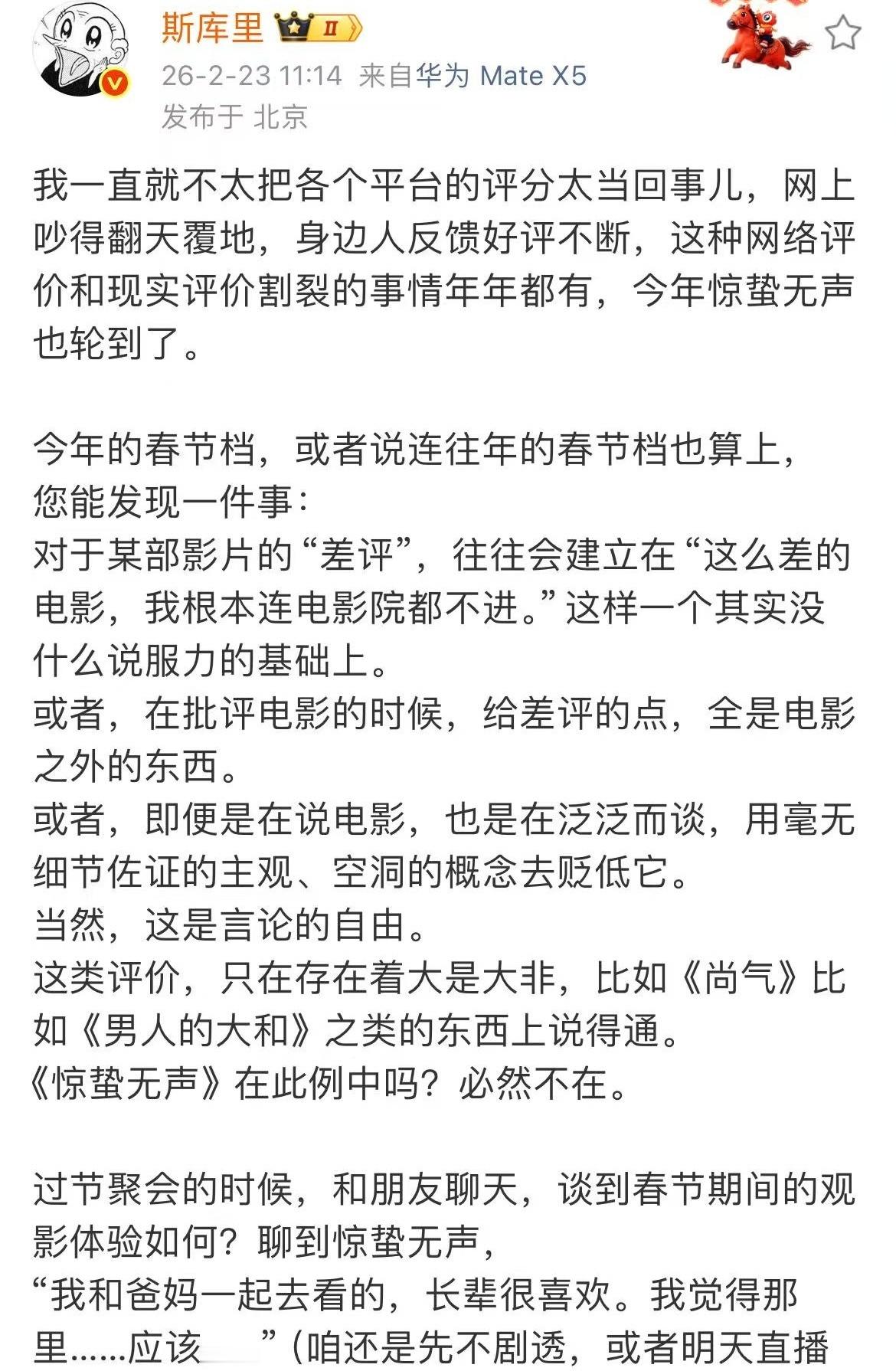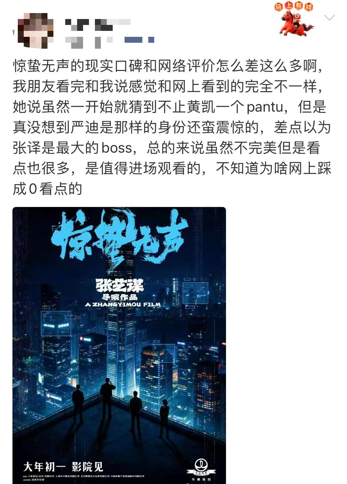 惊蛰无声网络评价和现实评价《惊蛰无声》的讨论声量大有各种各样的原因,但不可否认的是在现实中确实收获到了非常多有意义的好评价,身边的长辈、朋友在不了解电影阵容班底的情况下坐进去也都收获了很好的体验,还会一起讨论“丢卒保车”、仙人跳、谁是双面间谍这些细节,气氛超好🎬推荐自己去影院感受一下~