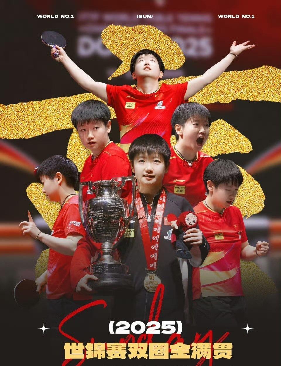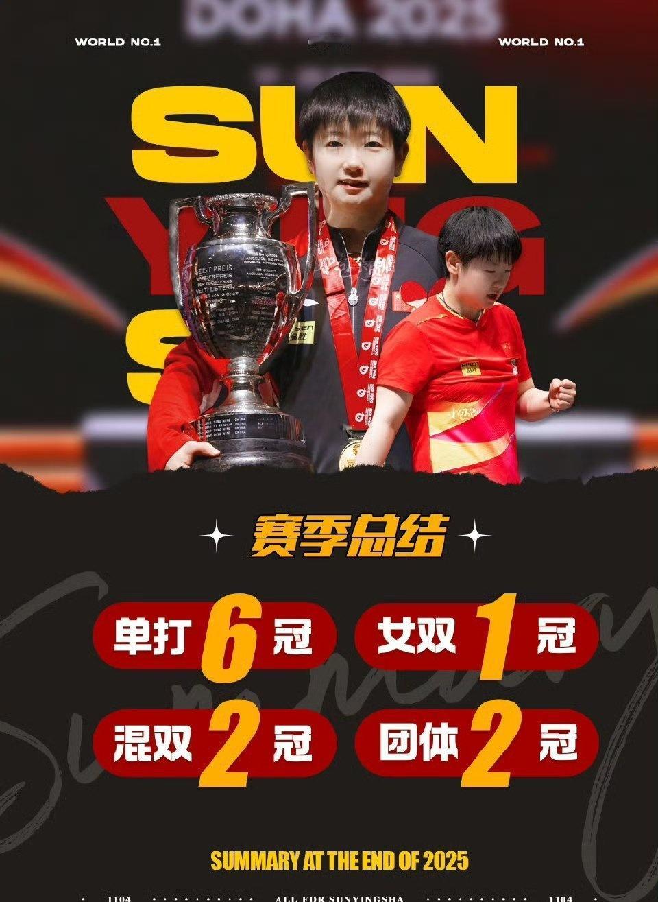 孙颖莎👉🏻截至目前,孙颖莎共获1️⃣0️⃣9️⃣个冠军(甲级联赛不计入),包括3️⃣个奥运冠军+1️⃣8️⃣个世界冠军+3️⃣5️⃣个九大赛冠军,3️⃣9️⃣个单打冠军+2️⃣3️⃣个混双冠军+1️⃣7️⃣个女双冠军+3️⃣0️⃣个团体冠军。 👉🏻孙颖莎是奥运三金王/闭幕式亚洲代表➕女乒历史唯一世锦赛双圈金满贯➕世界杯卫冕冠军➕三大赛单打四金王➕手握18个世界冠军、35个九大赛冠军,且是WTT史上首位冠军/首位大满贯赛单双混三冠王/首位大满贯赛单打四冠王/首位总决赛单打三冠王/首位冠军赛单打七冠王➕万分女王,曾女单女双混双同时登顶世界第一、女单连续4年年终世界第一
