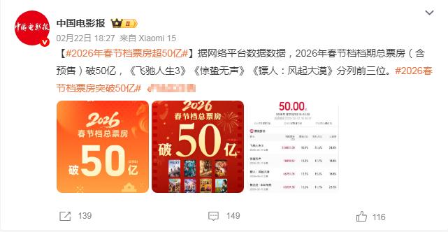 今年春节档电影票房只能用“惨”字来形容! 晚上看到“2026春节档票房突破50亿”热搜话题,说实在的,这个票房数字是真的很差,只能用“惨”字来形容,要知道2025年春节档电影票房可是达到了95亿元,这就是说2026年的春节档票房差不多腰斩了一半。 哪怕跟之前电影票房最差的2021年相比,那时候春节档电影票房也有60亿元,足见今年春节档电影票房是真的很差。不过有一点也是挺意外的,即使是50亿元的电影票房,也是春节期间全球票房最高的市场,这也从另外一个角度说明,中国电影票房变差也不是个别现象,而是全球电影市场大环境都一样很差。 大家认为院线电影市场未来会变好吗?