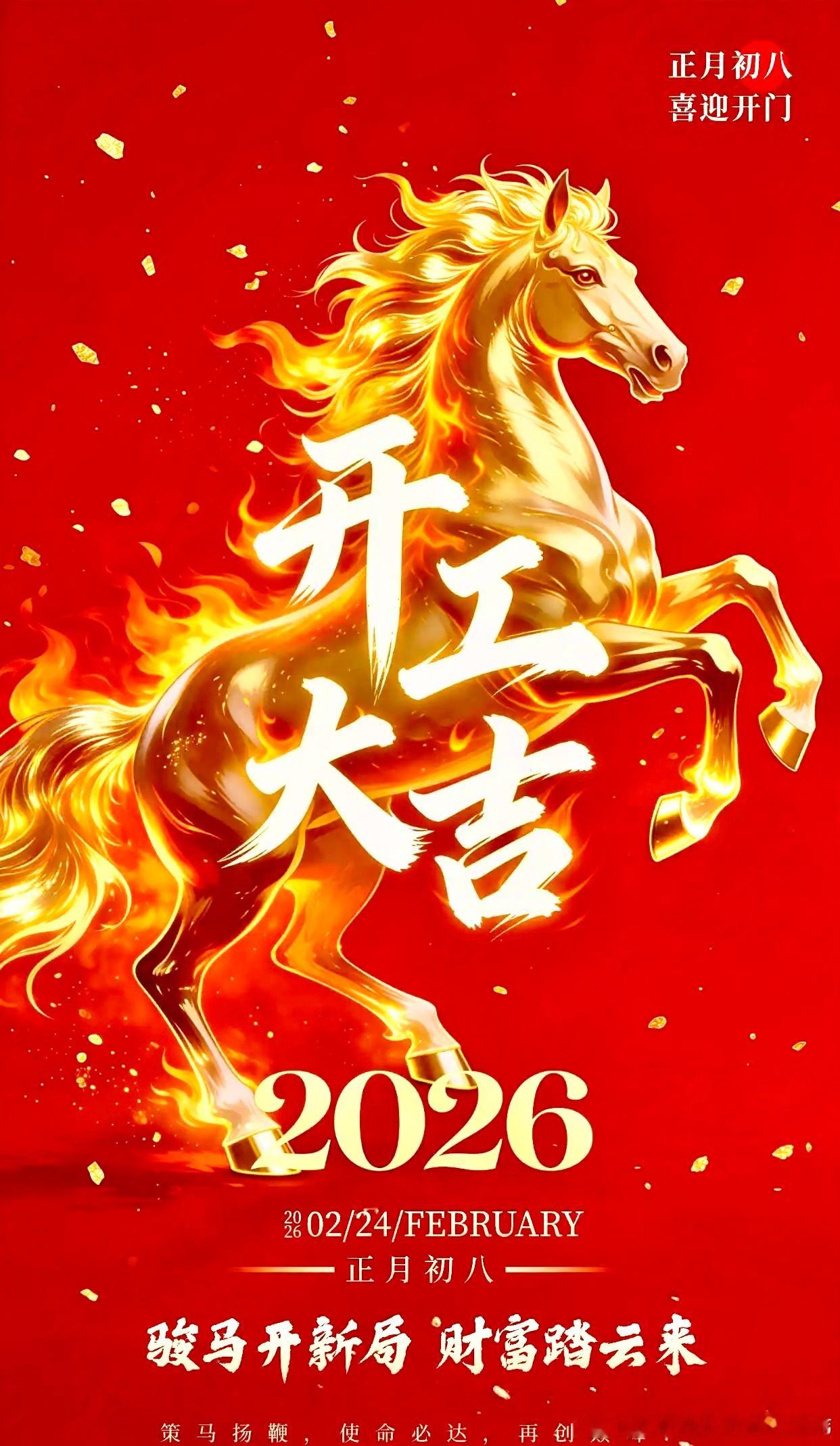 正月初八,春意渐浓,鸿运启程。在这丙午马年的奋进之初,愿这十二份诚挚的祝福,化作您前进路上的春风与动力。 祝您开工大吉,事业如骏马腾飞,一路顺遂;生活如春日暖阳,安康美满。 2026,我们一起,策马扬鞭,共赴新征程!
