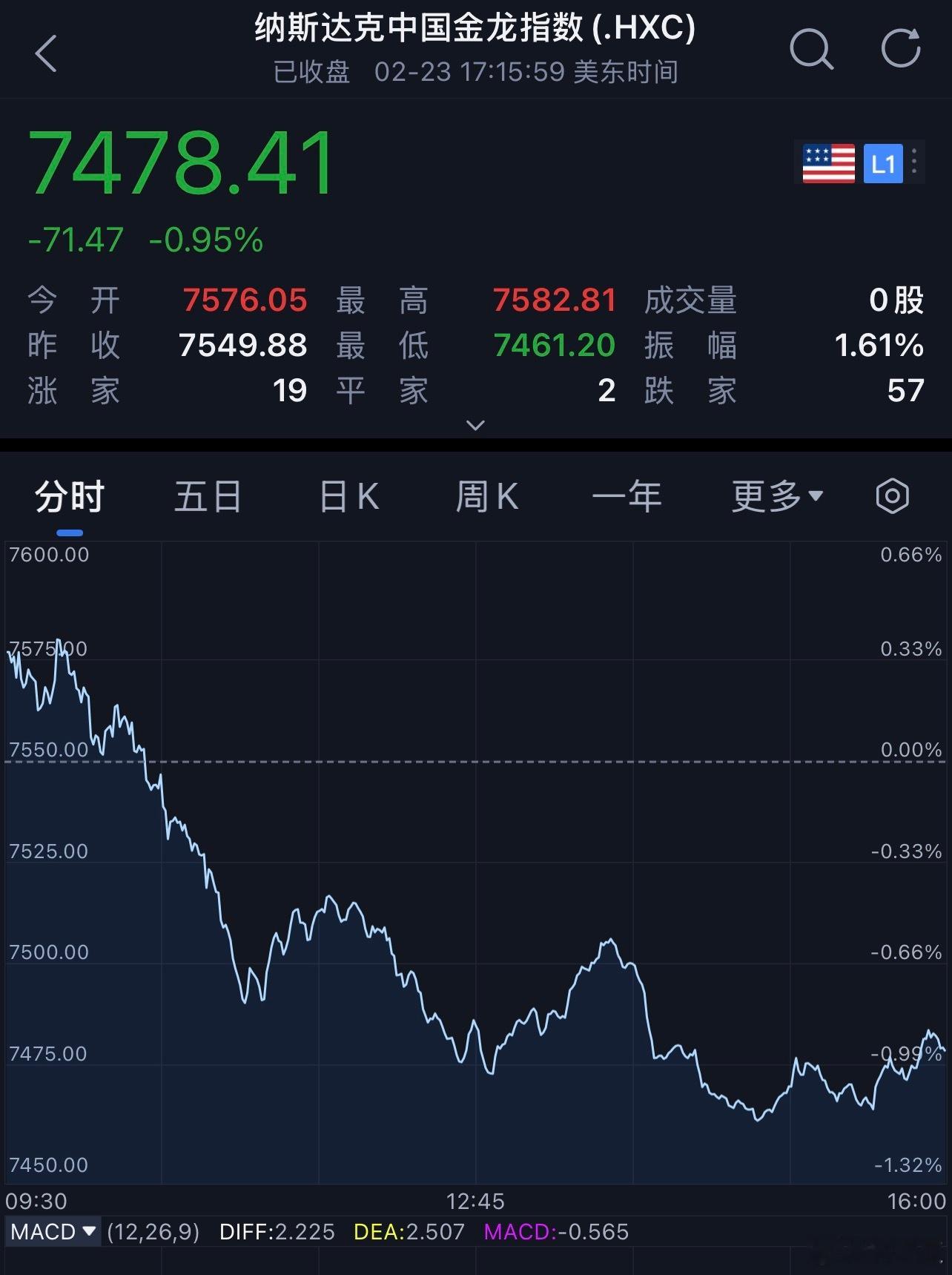中概股也受到大盘拖累走弱,纳斯达克中国金龙指数收跌0.95%。
