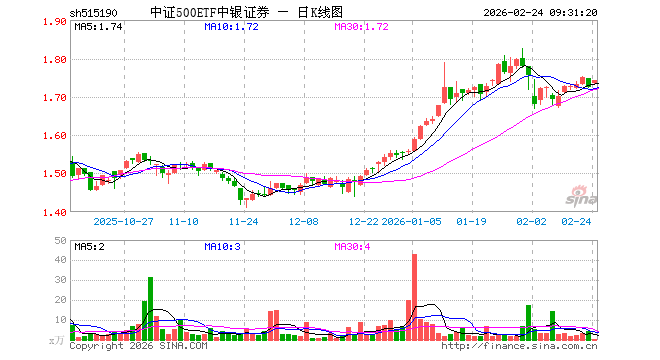 中证500ETF中银证券(515190)业绩比较基准为中证500指数收益率,管理人为中银国际证券股份有限公司,基金经理为张艺敏、刘先政,成立(2020-04-30)以来回报为72.66%,近一个月回报为1.90%。