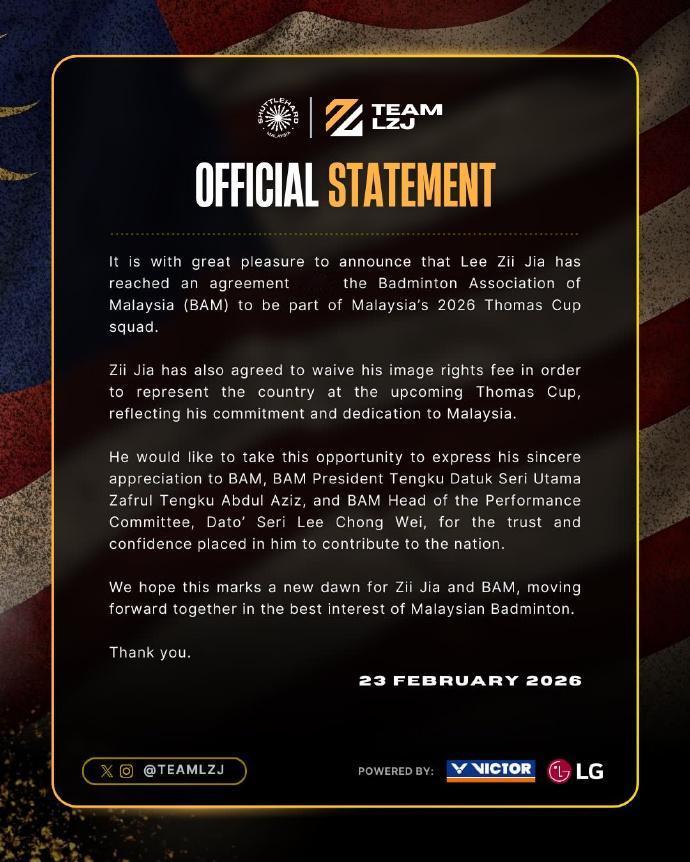 李梓嘉:接受大马羽协邀请参战汤杯;球友:飘了 非常高兴地宣布李梓嘉与马来西亚羽毛球协会达成协议,将入选2026年汤姆斯杯马来西亚队伍。梓嘉也已同意放弃其肖像权使用费,以便代表马来西亚参加即将举行的汤姆斯杯,这体现了他为马来西亚所做出的承诺和贡献。 他借此机会衷心感谢大马羽协主席东姑扎夫鲁和大马羽协绩效委员会主席拿督李宗伟,感谢他们对他寄予的信任和厚望,让他能够为国家做出贡献。我们希望这标志着梓嘉和大马羽协进入新的开端,双方将携手为马来西亚羽毛球事业的发展做出最大的贡献。 PS:小李最近水平没涨多少,派头倒是大了很多。职业球员都是以成绩说话的,近2个赛季表现都一般吧,还有伤病,就算参加能为大马拿到几分呢?面对其他协会的一单球员,也不敢保证赢球。