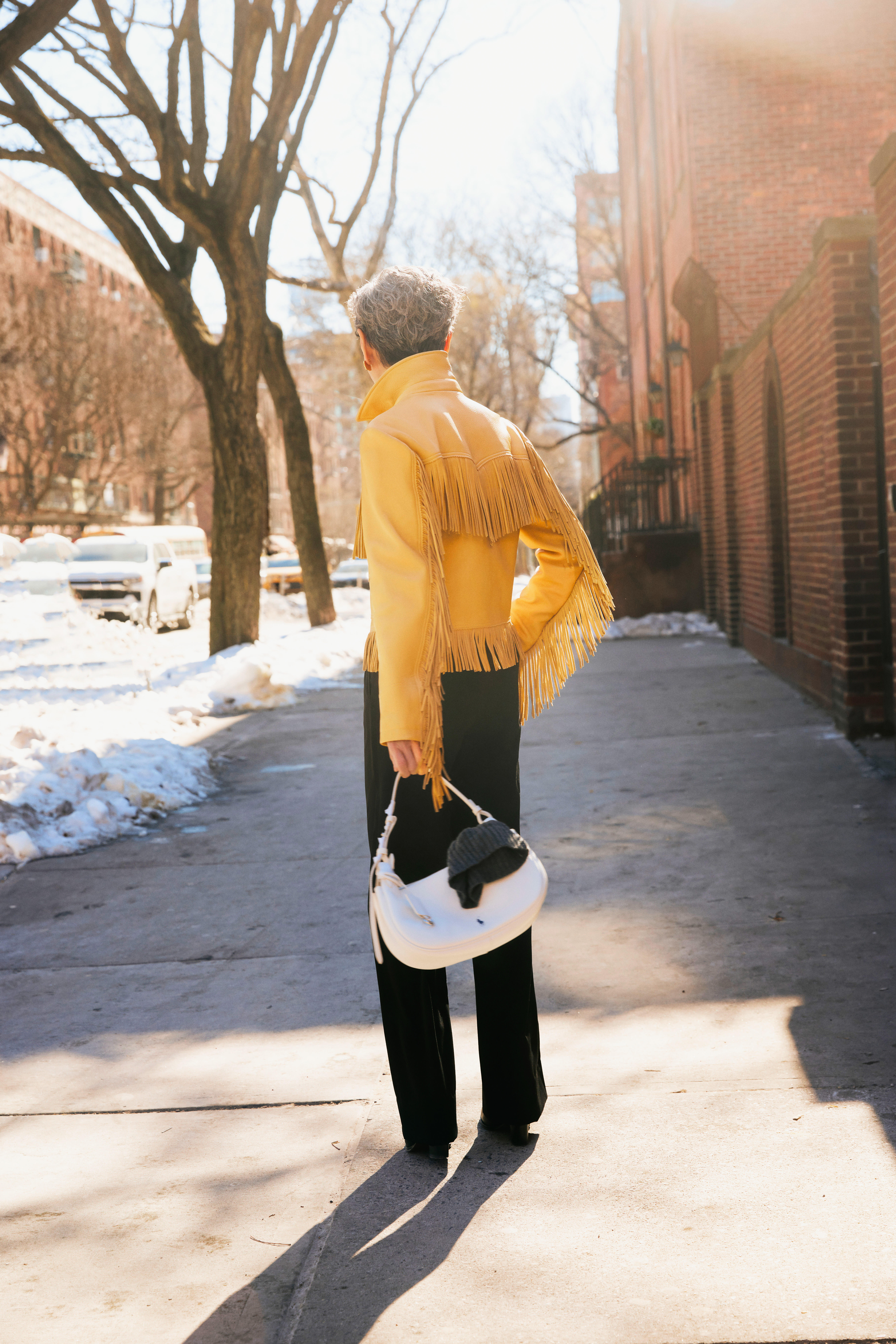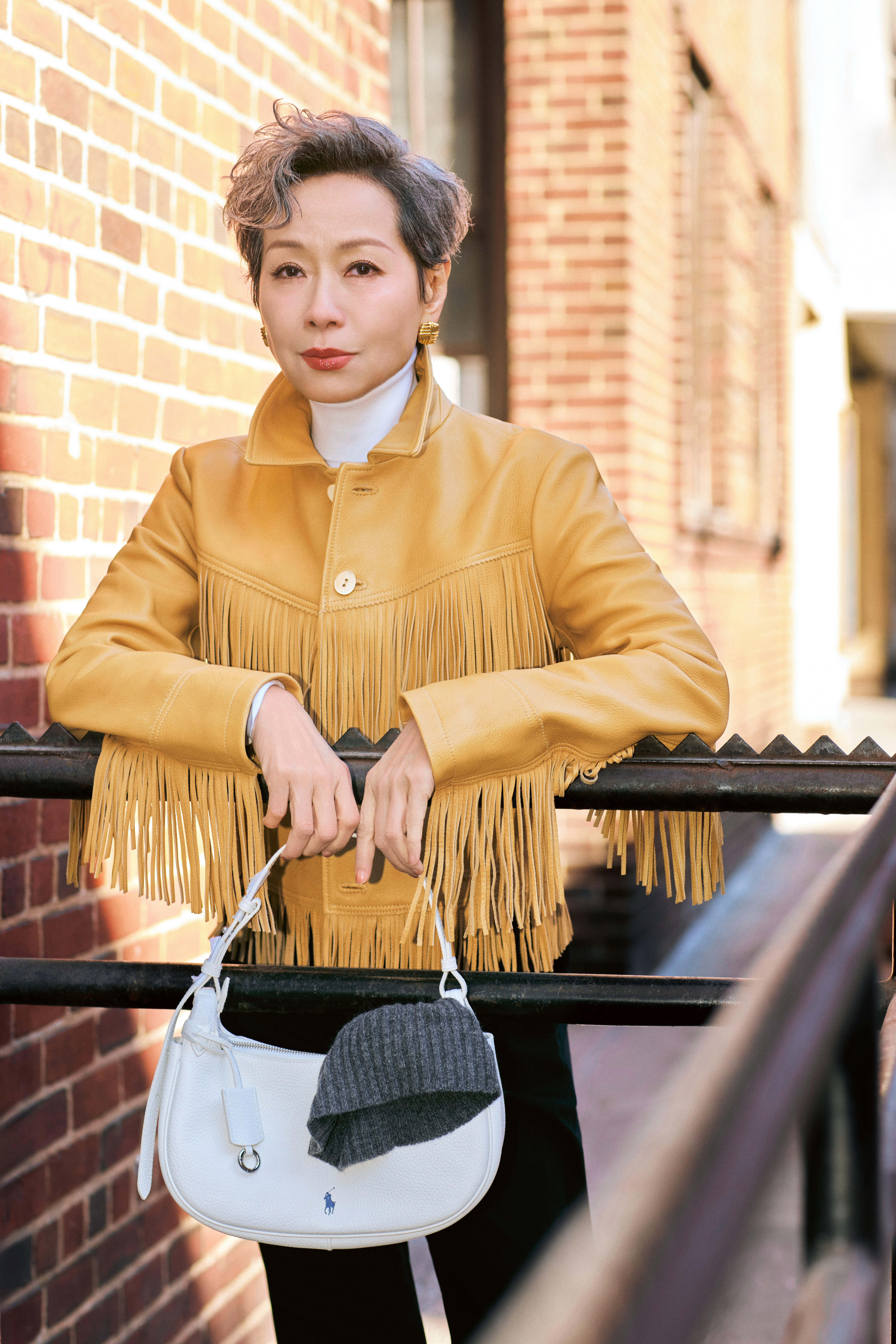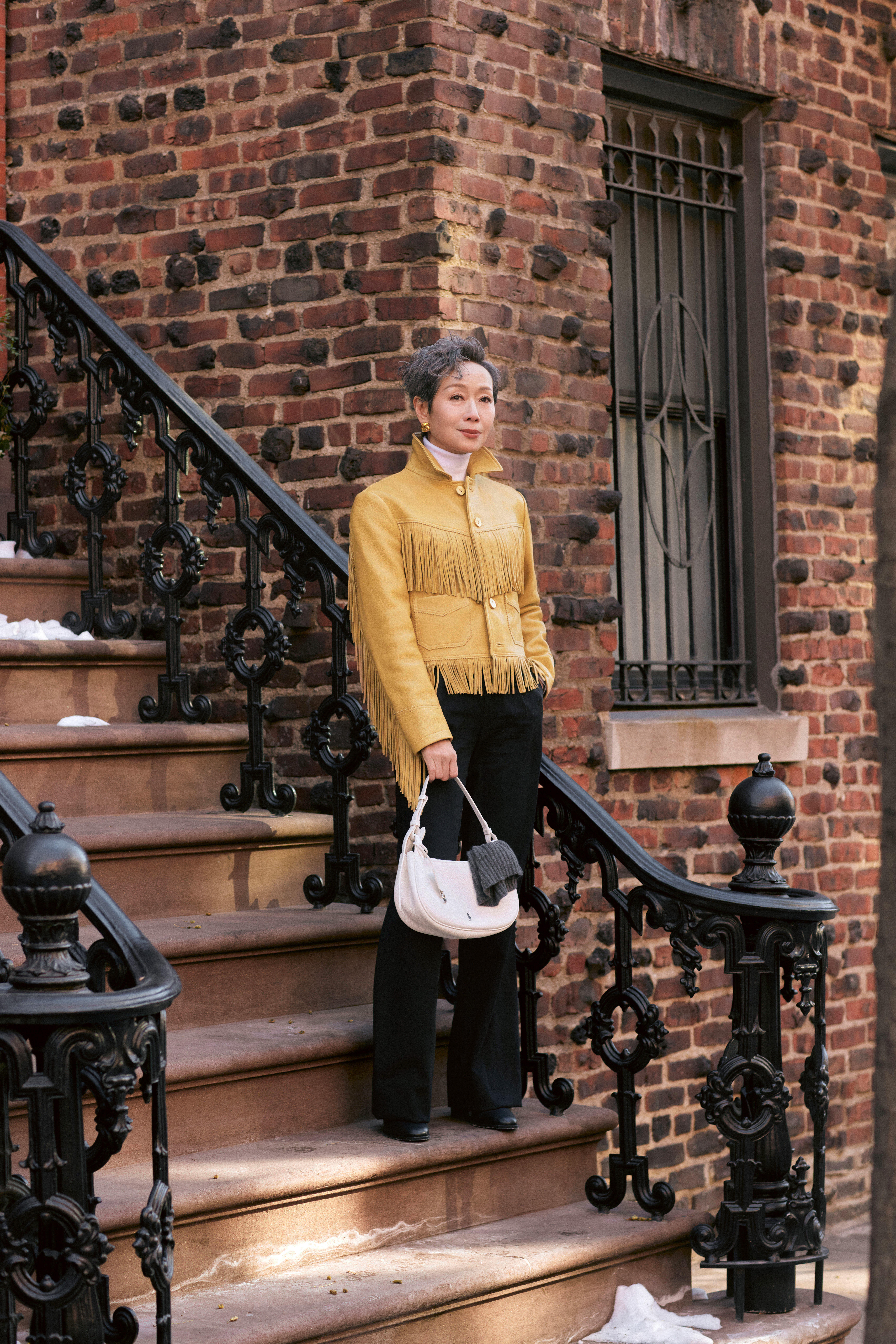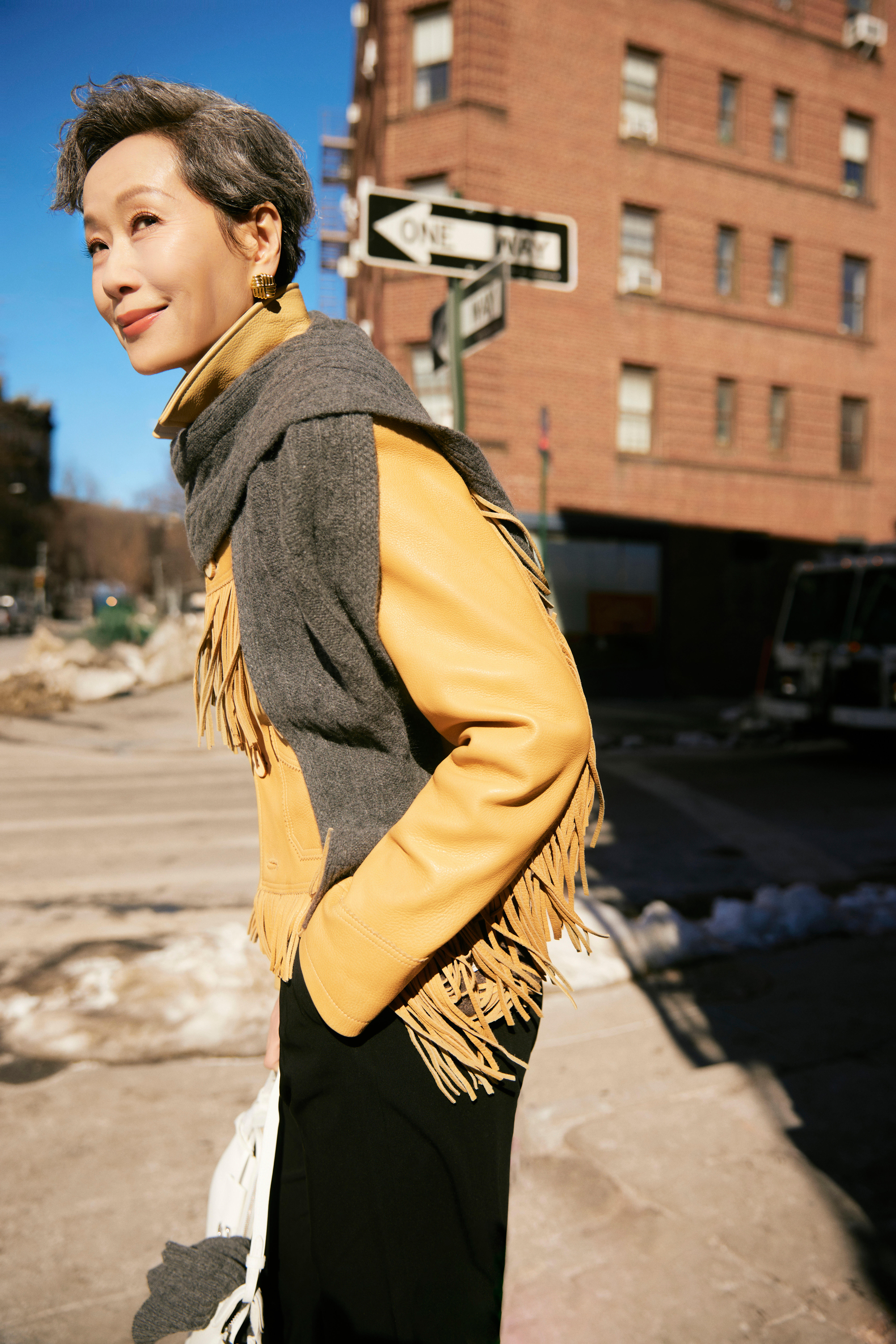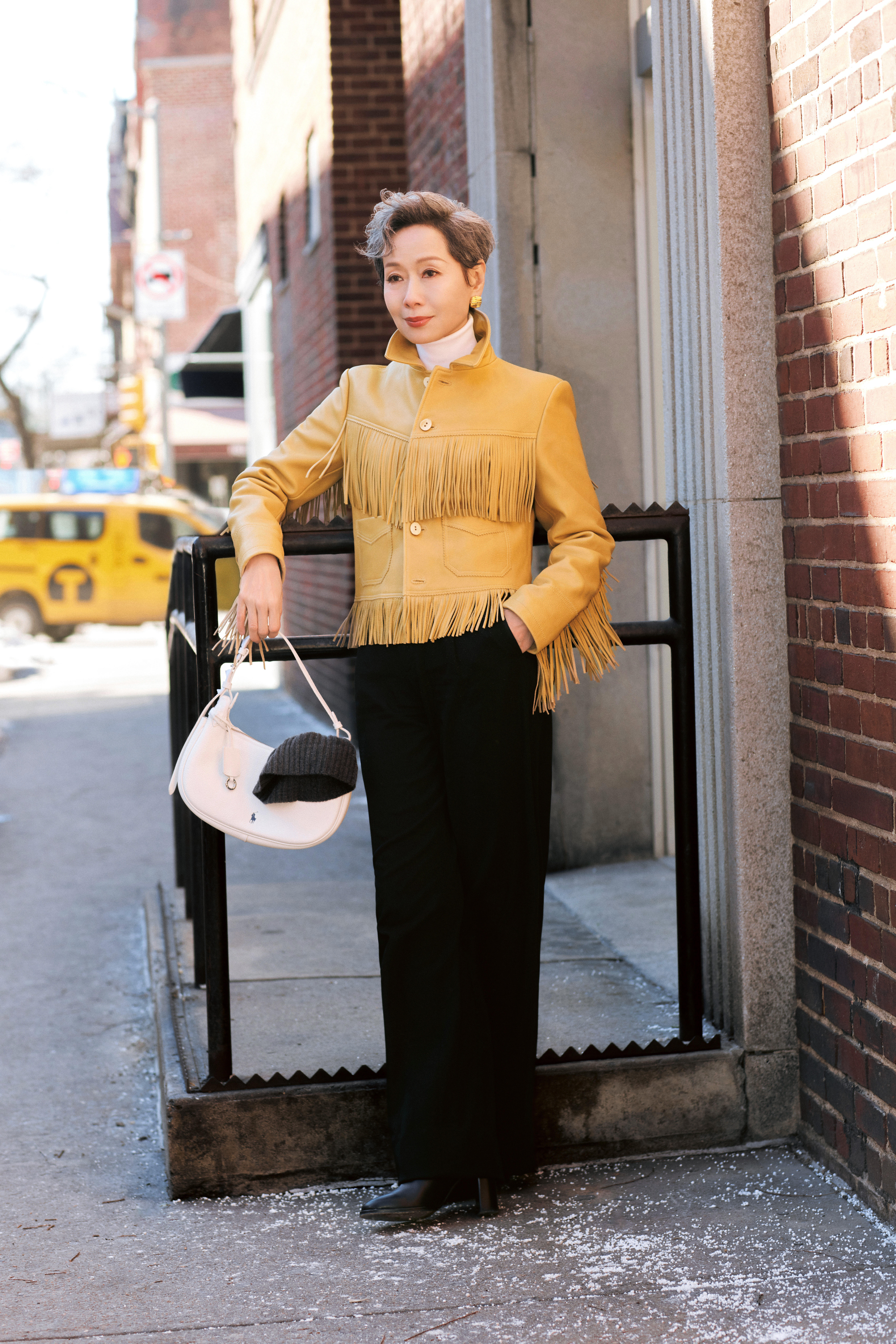 叶童纽约街头look,黄色皮衣+白色内搭+黑色长裤,酷帅有型