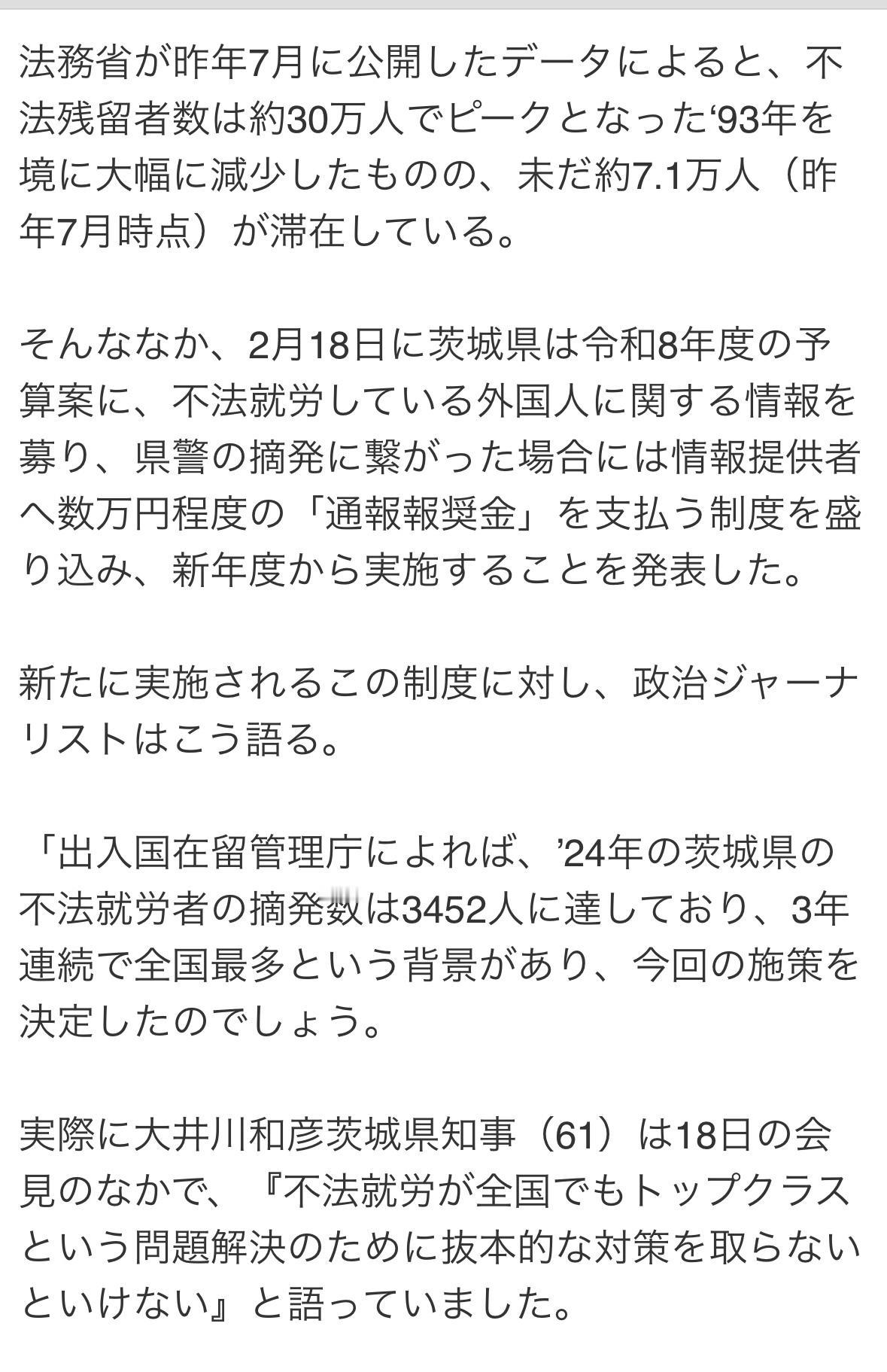 有奖举报外国人非法打工!非法滞在自1993年30万人的峰值以来明显下降,截至去年7月仍有7.1万人。 2月18日茨城县宣布,其26年预算提案将包含一项收集非法外国人打工信息制度。如果该信息最终促成县警逮捕非法打工者,举报人将获得数万日元的奖励。 入管局自1951年起就已实施类似的制度。如果被举报人被签发驱逐令,举报人将获得最高5万日元的奖励,这在《出入境管理法》第66条中也有明确规定。