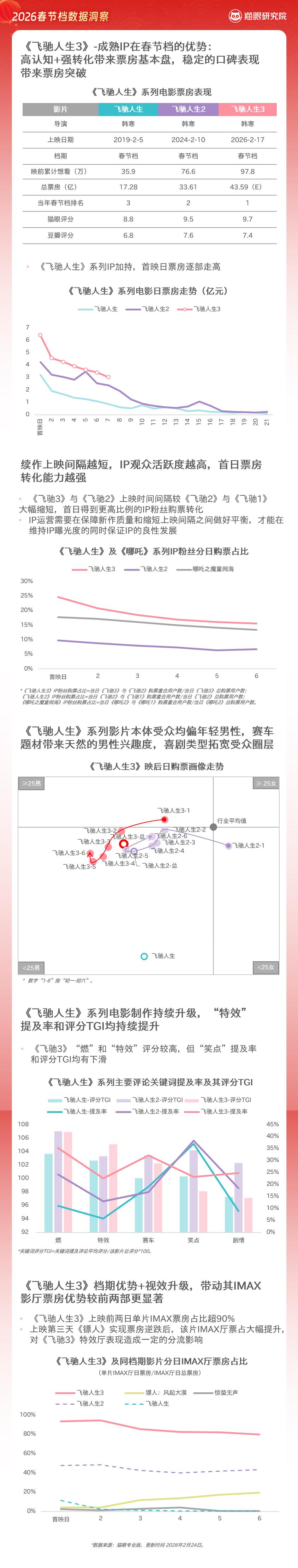 听听温特怎么说猫眼研究院发布2026春节档数据洞察 数据显示,2026年春节档总票房57.52亿元 ,总观影人次1.2亿。总场次数超435万,创影史春节档总场次数新高,平均票价则降至近六年最低水平。档期内三四线城市票房占比接近六成,为近六年最高,下沉市场消费潜力得到进一步释放。档期内票房前三名的影片分别为《飞驰人生3》《惊蛰无声》《镖人:风起大漠》,其中,《飞驰人生3》以超29亿的绝对优势,稳居档期票房榜首;《镖人:风起大漠》则成为今年春节档唯一实现票房逆跌的影片,展现出黑马之势。在《飞驰人生3》和《镖人:风起大漠》的带动下,今年春节档购票画像也首次更偏向年长男性。整体上看,由于缺乏强流量高热度的爆款大片的带动,春节档整体表现平平。虽然仅有初一当天单日票房过10亿,但整体仍保持住了较为稳定的跌幅。👀更多独家洞察,点击报告⬇️