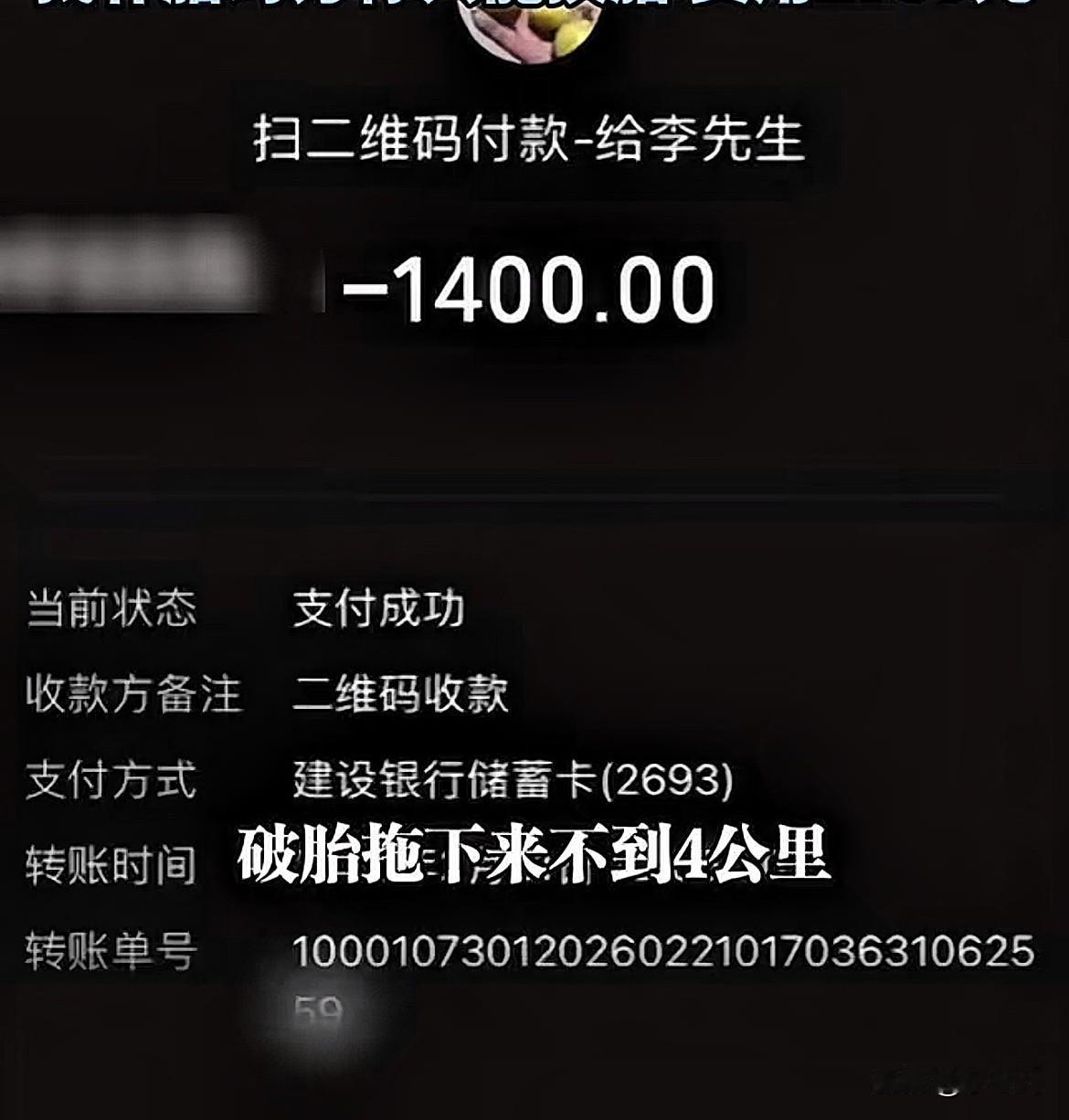 太坑了!男子开车自驾游到云南大理,谁知车胎在高速上扎破了,无奈只能叫拖车,拖车4公里花了1400元,这还不算完,好不容易找个补胎的,让换胎又花了1780元,男子扬言:“这下被宰了!” 4公里拖车费1400元,只负责拖下高速,男子出门在外,人生地不熟的,找个补胎的,说补不了,只能换胎,又花了1780元,这不是妥妥的冤大头吗? 男子的这个遭遇实在让人同情,本身过去旅游,也能促进当地旅游业发展,这么一整,名声臭了,谁还敢去呢?可不能因小失大啊。 同时这种宰客乱象就应该及时整顿治理,对于这种行为要及时曝光,让大家避坑,对于这种遭遇,大家如何看呢? (信息来源:中安在线)