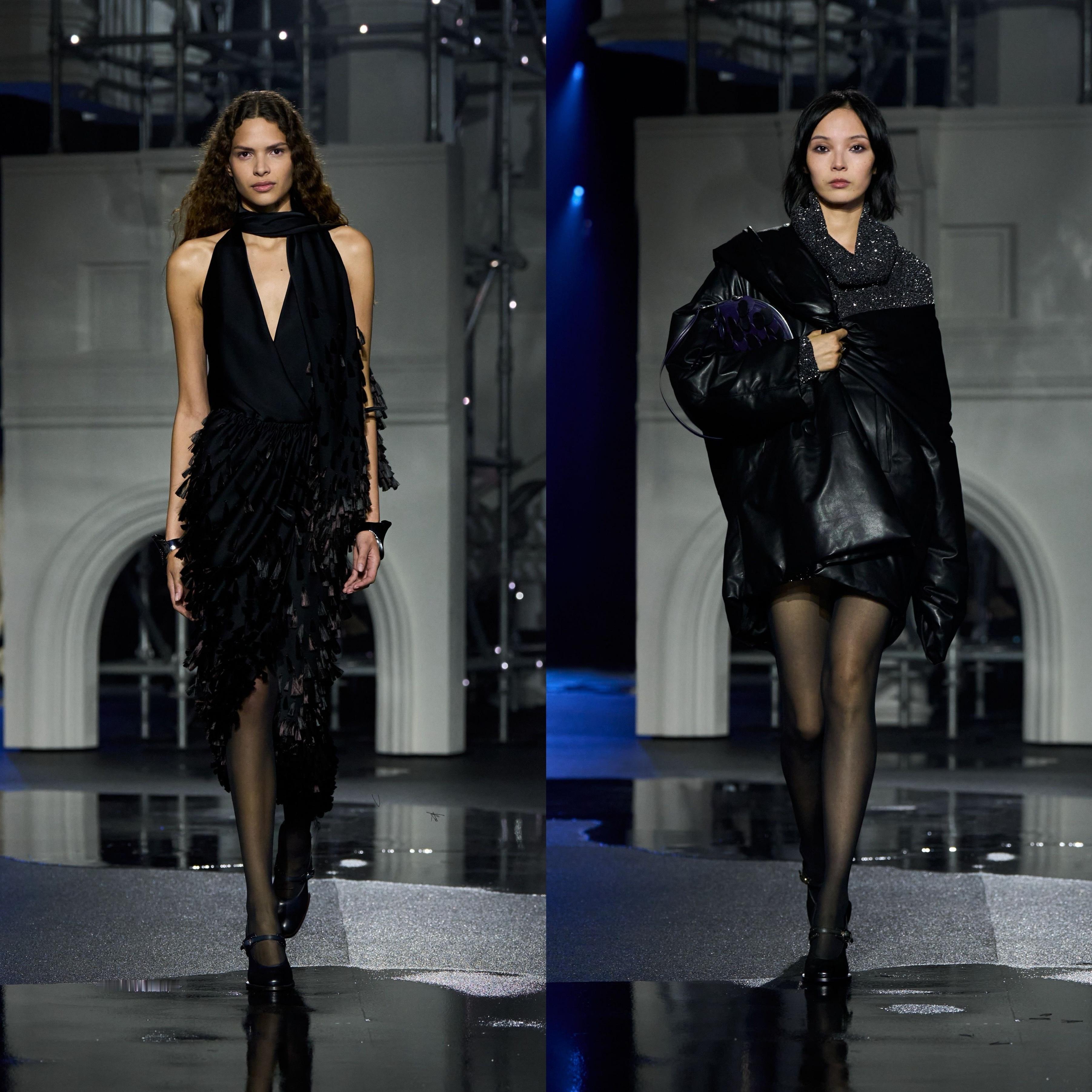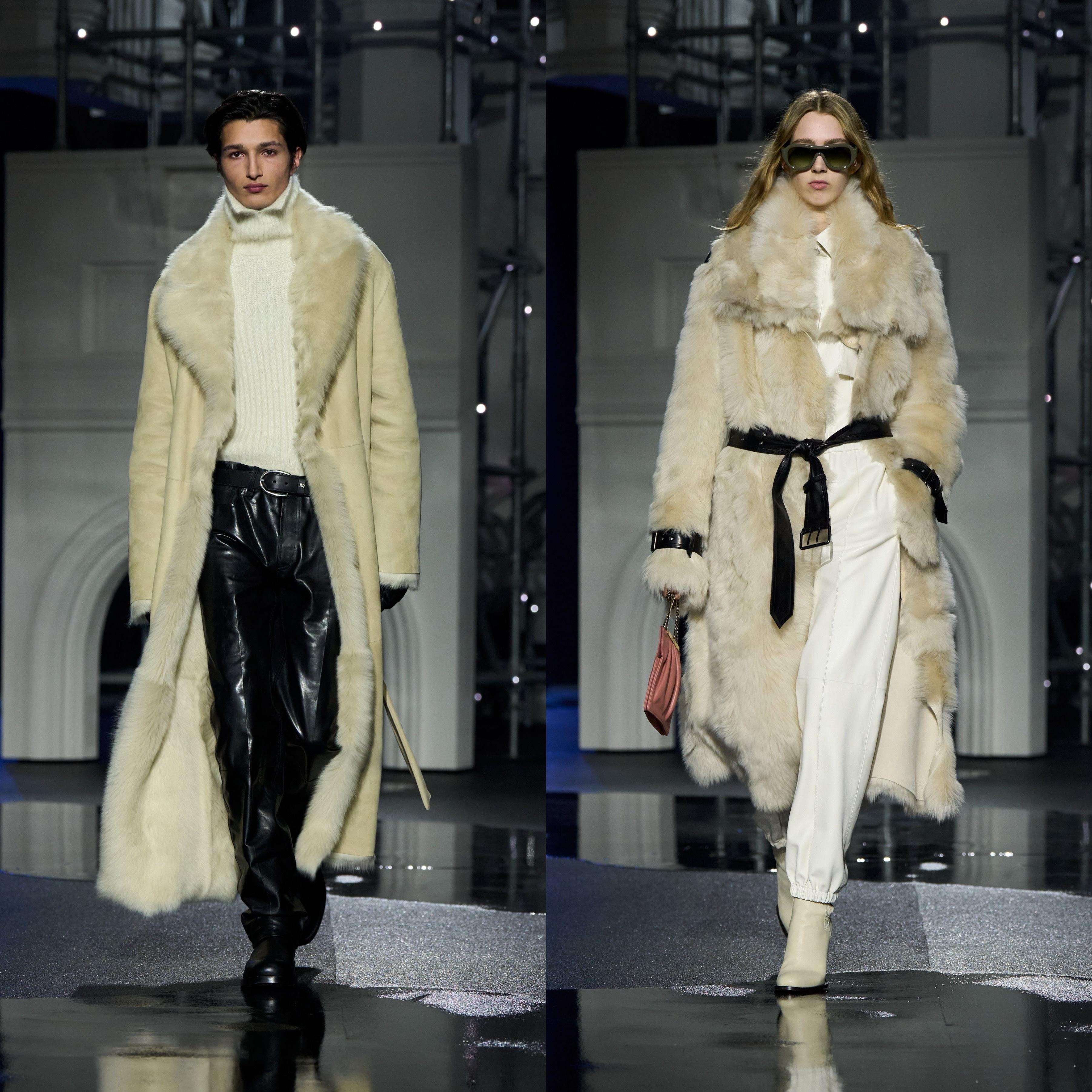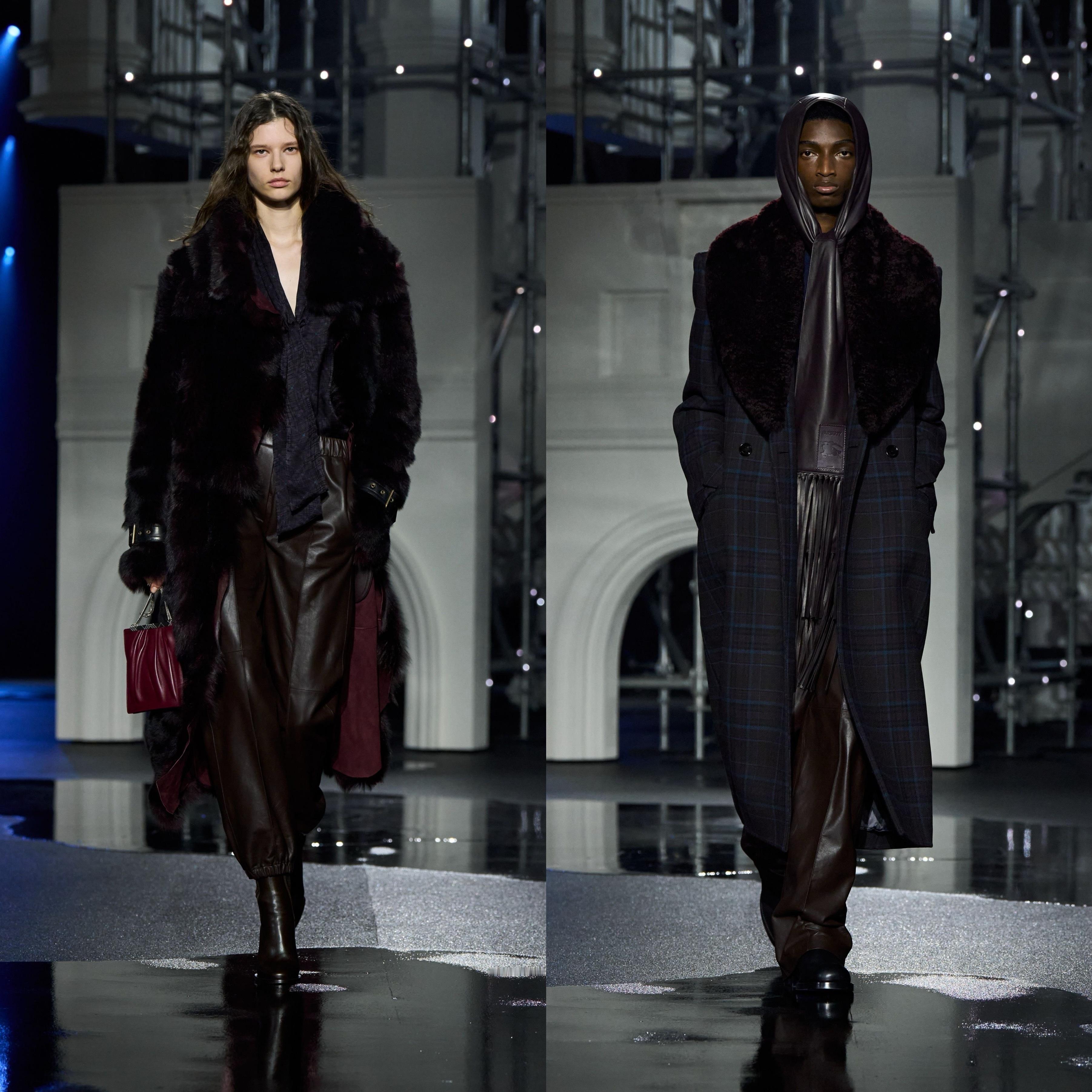 经典风衣迎来全新表达 ,女装中将其如配饰般搭于缎面裙装 ,领口采用罗缎材质搭配褶饰细节 ,质感拉满 。格纹元素焕新演绎融入设计 ,外套羊毛皮边缘保留原生质感 ,光滑的羊羔皮折射出夜幕般的虹彩光泽 。男装部分则让功能性单品兼具晚装质感 ,皮革飞行夹克 、连帽衫与风衣碰撞出优雅摩登的英伦新格调 ,完美适配昼夜多元穿搭场景 !