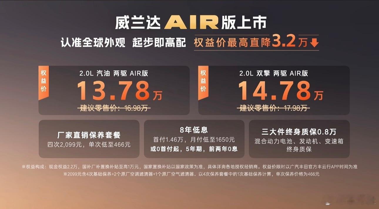 威兰达AIR版上市13.78万起广汽丰田发布厂家直销保养套餐 正月初八开工上新!广汽丰田全新威兰达AIR版正式登场,13.78万元起,直接重塑13万级合资SUV质价比!