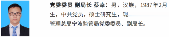 蔡幸:男,汉族,1987年2月生,中共党员,硕士研究生,现任国家金融监督管理总局宁波监管局党委委员、副局长。