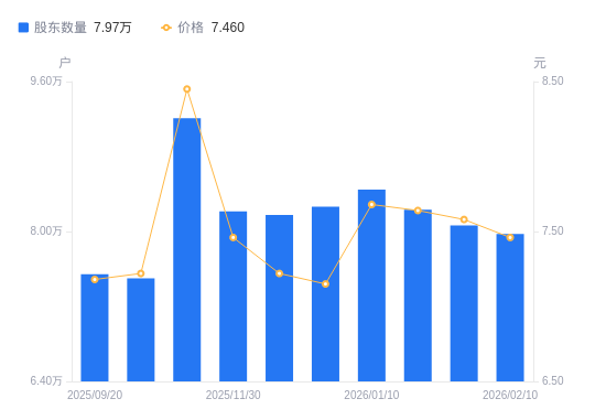 日期A股户数(户)流通A股户均持股数(股)户均持股市值(万元)2026-02-107972721083.4015.732026-01-318065420841.0715.802026-01-208230920422.0215.602026-01-108447719897.9115.282025-12-318264720338.5014.542025-12-208176720557.3914.842025-11-308213420465.5315.272025-11-109207418256.1415.432025-09-307500222411.6116.182025-09-207545422277.3616.00