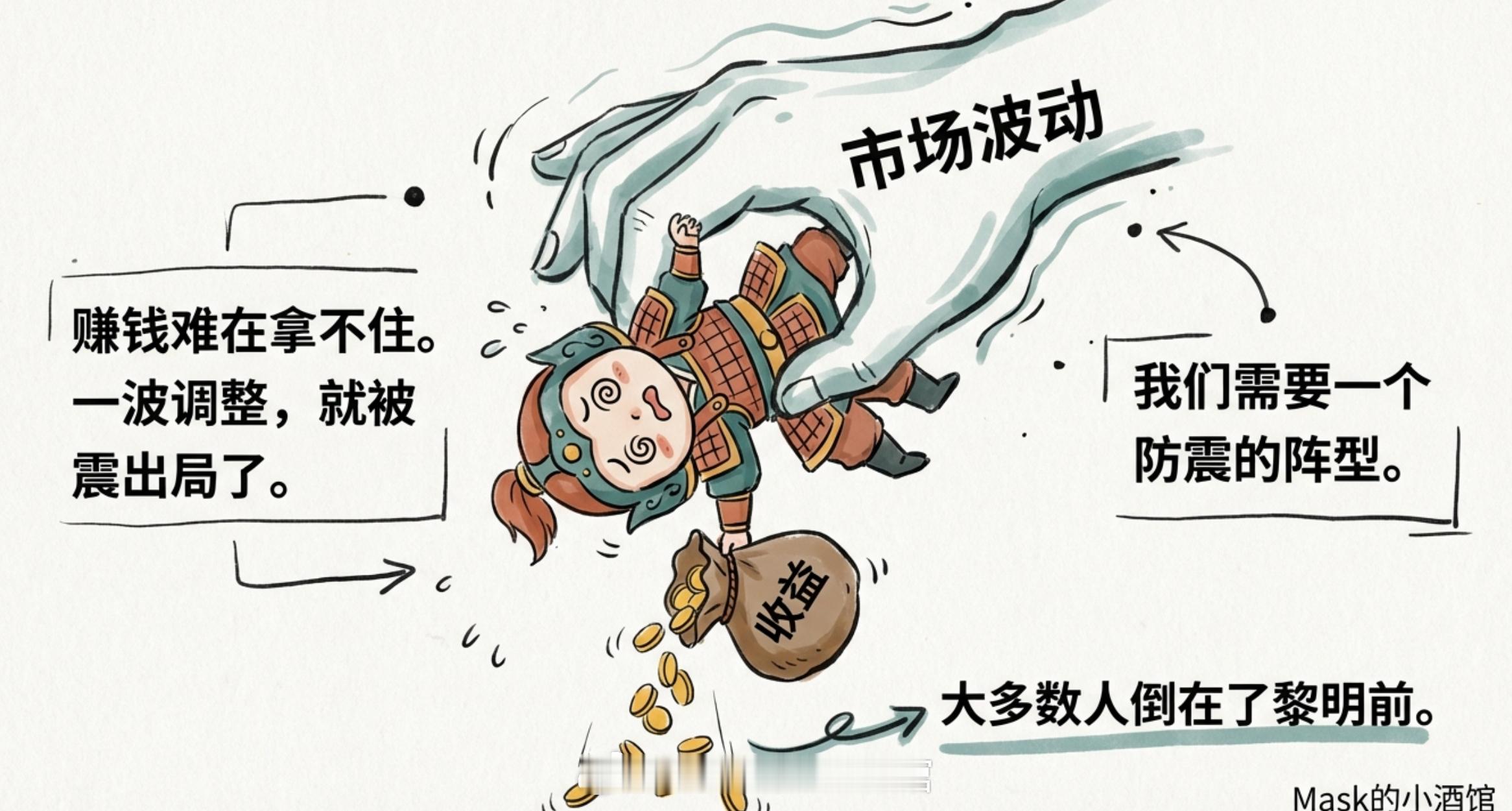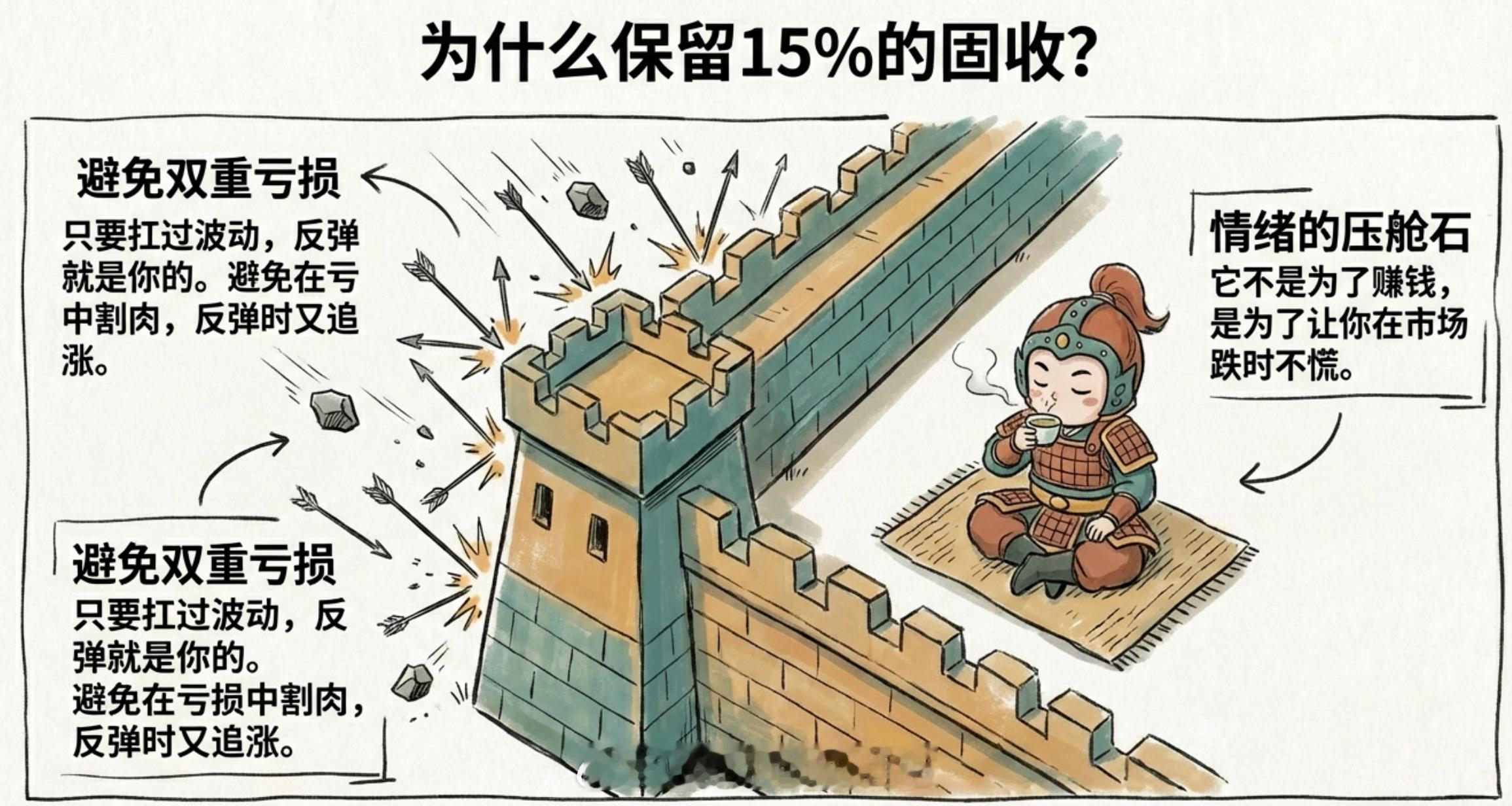 很多人看到这里会问:你不是要跑赢市场吗,为什么还要配15%的固收货币,不是在稀释收益?我以前也这么想。但投了这么久,我慢慢明白一件事——固收这15%,它不是来赚钱的,它是来稳住你情绪的。市场跌的时候,这15%会让你的整体回撤小一点,你就不会那么慌,就不会在最难受的时候割肉。而一旦你能扛过去,后面的反弹就是你的。