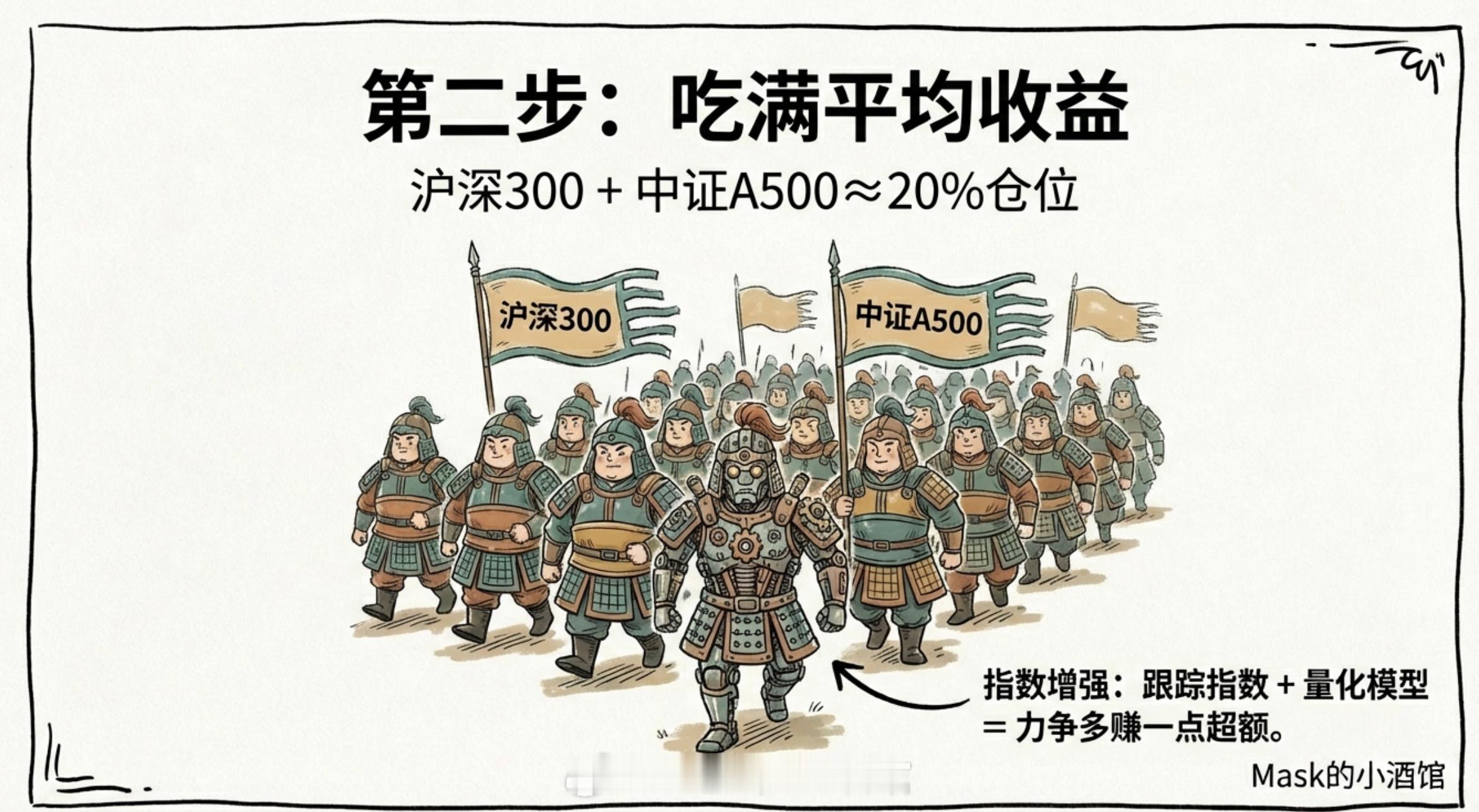 第二步,保证吃到市场的平均收益。沪深300加中证A500,两个加起来占了20%的仓位。有了这两个宽基,市场整体的涨幅我们基本上跑不掉——因为它们就是市场本身。