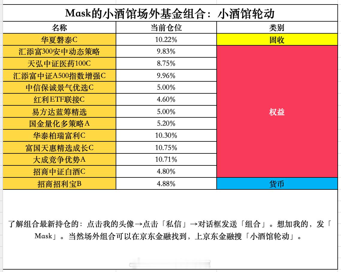 这就是小酒馆轮动这个组合,从一开始就想解决的问题。我们现在的结构是:10%固收 + 5%货币 + 85%权益,具体持仓如下: