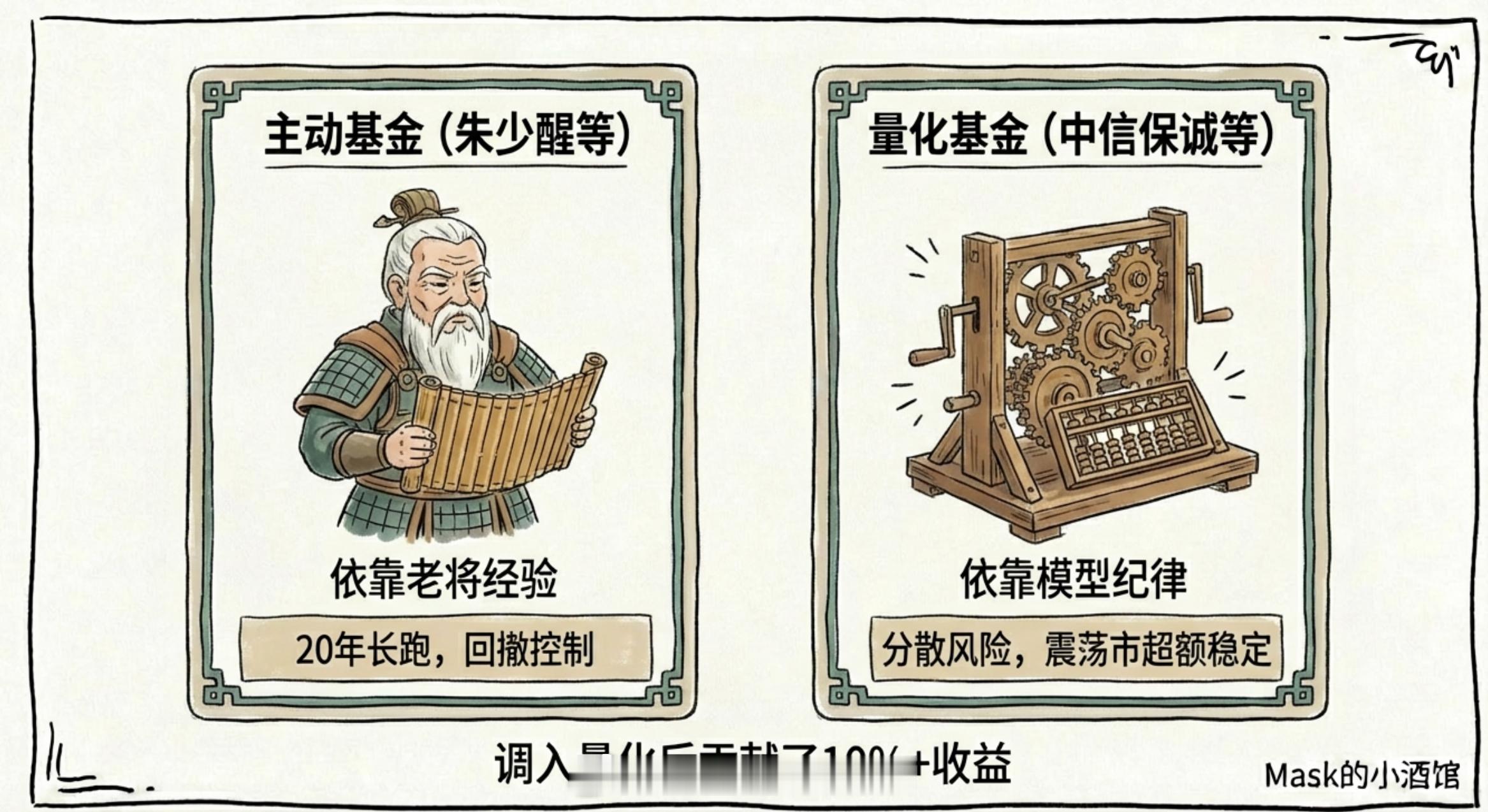 很多人现在不敢碰这两个板块,因为它们跌了太久。但根据招商证券今年1月的数据,白酒板块当前估值历史分位数在15%以内,茅台、五粮液、泸州老窖的PE估值自上市以来的分位数分别约为21%、10%、11%,均处于历史低位。更关键的是,公募基金对白酒的重仓持股比例已经降到了5.52%,这意味着机构都在低配,筹码结构已经非常干净。低估是一个前提,但低估不等于马上就涨。那什么是催化剂?今年春节茅台的价格出现了明显回升,市场对白酒消费复苏的预期正在慢慢修复。有机构预判,2026年二季度起,酒企业绩增速在低基数背景下大概率逐季上行。医药同理,估值在历史低位,政策端的压制经过这几年已经大部分释放,月线的技术形态也在慢慢好转。当然,这里我必须说清楚:白酒医药现在是不是已经确定触底,市场上还有很大分歧。没有人能保证它明天就涨,也没有人知道它还会不会再跌一段。我们做的只是在估值历史低位,用一部分仓位去布局,等待周期回来。这是一种耐心,不是赌博。除了这些板块性配置,我们还有几个混合基金和量化基金作为补充。混合基金这块,核心是选基金经理,重点看的是两个指标:长期业绩和回撤控制能力。朱少醒管理的富国天惠是公募行业少有的20年长跑型基金,规模从高位回落之后,操作灵活性和调仓空间反而有所提升,这是一个值得关注的积极信号。