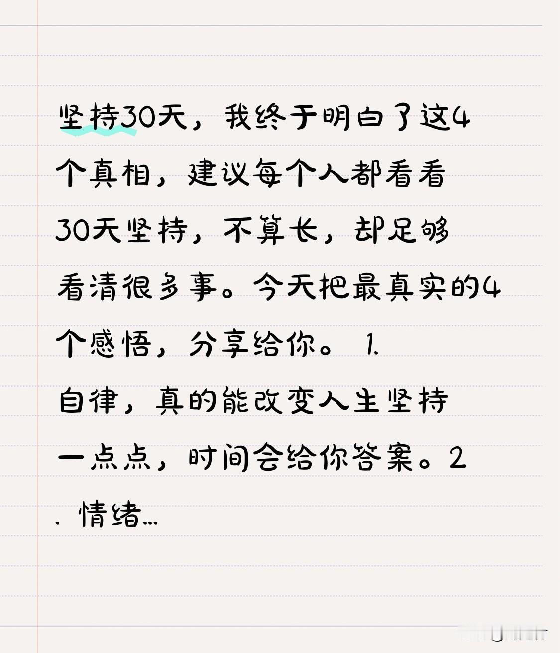 坚持30天,我终于悟透这4个真相,建议所有人都看看 30天的坚持不算久,却足以让人看清很多事。今天,我把最真实的4个感悟分享给你。 自律,真能改变人生。每天坚持一点,时间自会给出答案。 情绪稳定,比什么都重要。少生气、少内耗,多专注、多行动。 行动治愈一切焦虑。空想都是问题,行动才有答案。 慢慢来,反而更快。不急于求成,不半途而废,稳扎稳打才是王道。 30天结束并非终点,而是新的开始。下一个30天,让我们继续坚持,持续变好。 点赞收藏,一起加油,顶峰相见!坚持 要坚持的意义