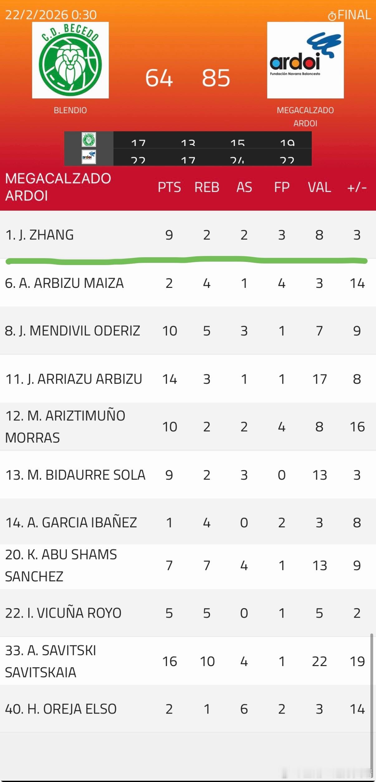 在个人表现方面: • Antón Savitski 表现最为突出,攻防两端都极具决定性,贡献 16分、10篮板、4助攻,效率值22。 • Jon Arriazu 也再次交出全面表现,拿下 14分,效率值17。 • Jon Mendívil 与 Migeltxo Ariztimuño 也均得分上双,各得 10分。