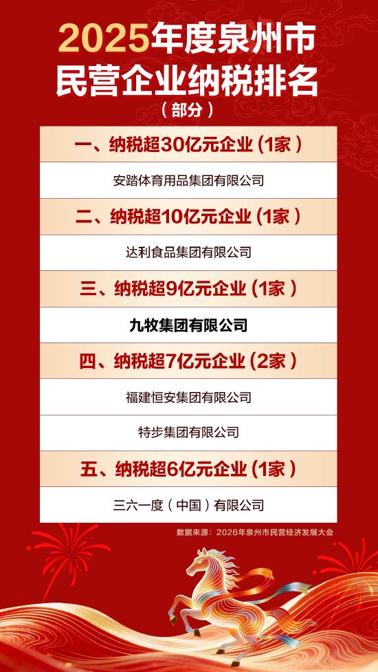 会上,2025年度泉州市民营企业纳税百强正式公布。九牧集团纳税超9亿元,与安踏、达利等知名企业位列前三!