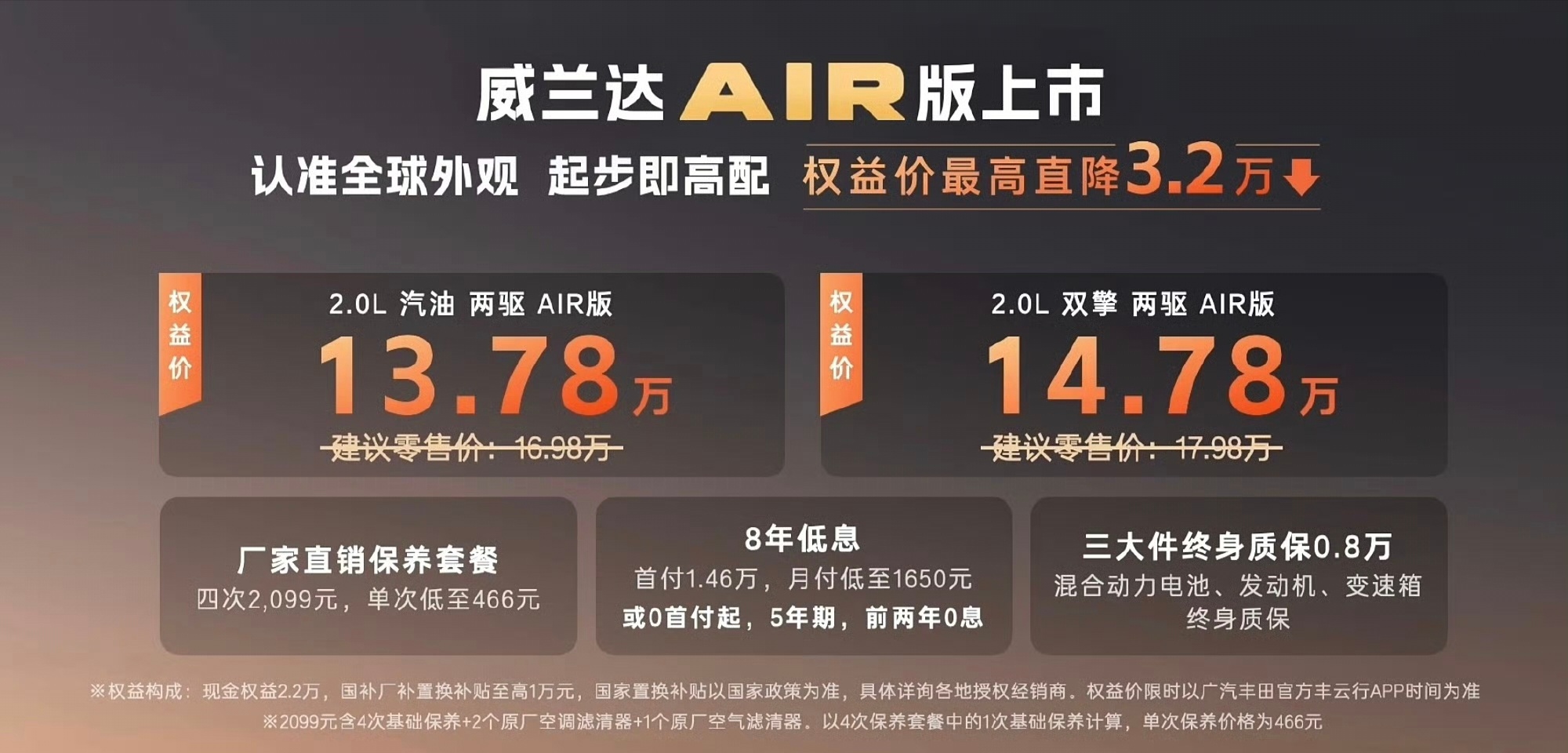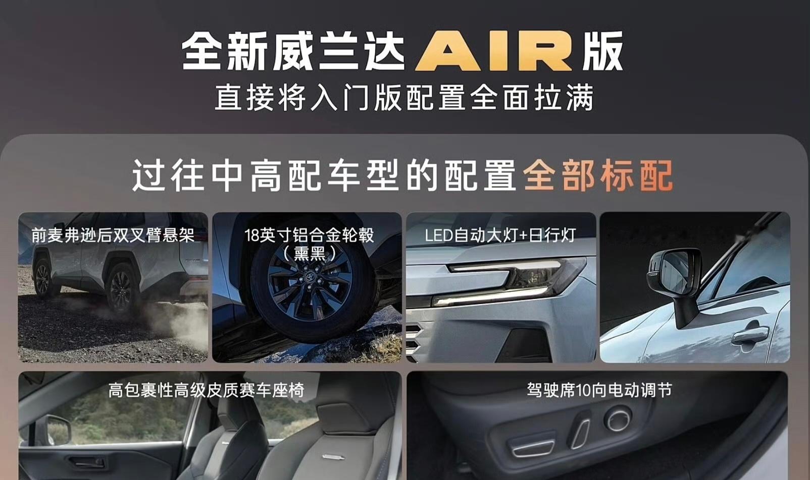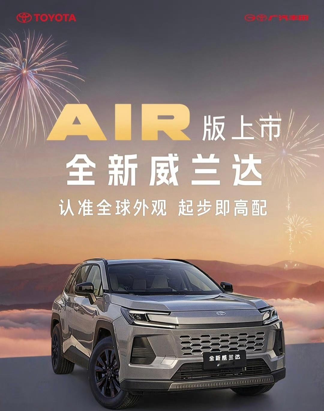 威兰达AIR版初八上市正月初八,开工大吉!广汽丰田威兰达AIR版正式上市,限时权益价13.78万起~新车延续全球经典设计,外观大气硬朗,气场十足,开在路上辨识度拉满,作为家用SUV,威兰达AIR版诚意拉满,标配TSS 4.0智行安全系统,实现L2级智能辅助驾驶,出行更安心。车内配备14英寸大屏、50W无线快充、电动天窗、真皮座椅等实用配置,舒适与科技一步到位。动力提供2.0L燃油与双擎混动可选,油耗经济、输出平顺,日常通勤与长途自驾都轻松胜任。更让人放心的是,三大核心部件享终身质保,品质有保障、用车无后顾之忧。空间宽敞舒适,底盘调校沉稳,兼顾操控与乘坐体验。无论是家庭出行、日常代步还是长途旅行,威兰达AIR版都能轻松胜任。13万级合资SUV,配置拉满、靠谱耐用,家用代步很靠谱!