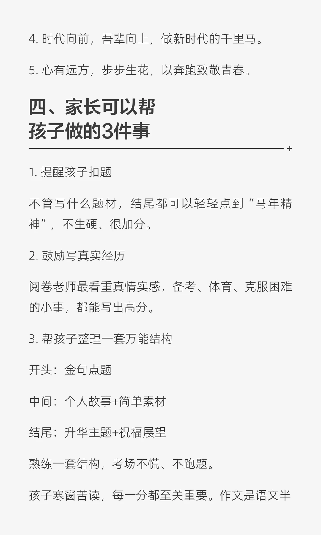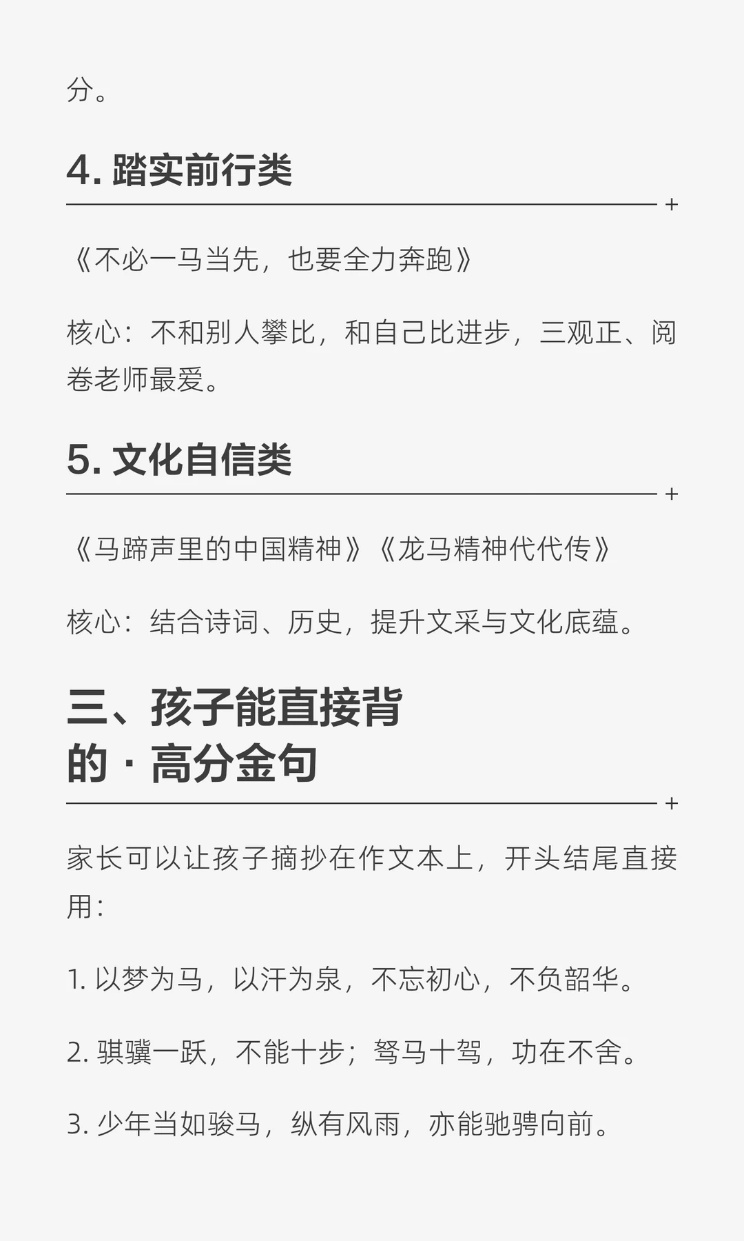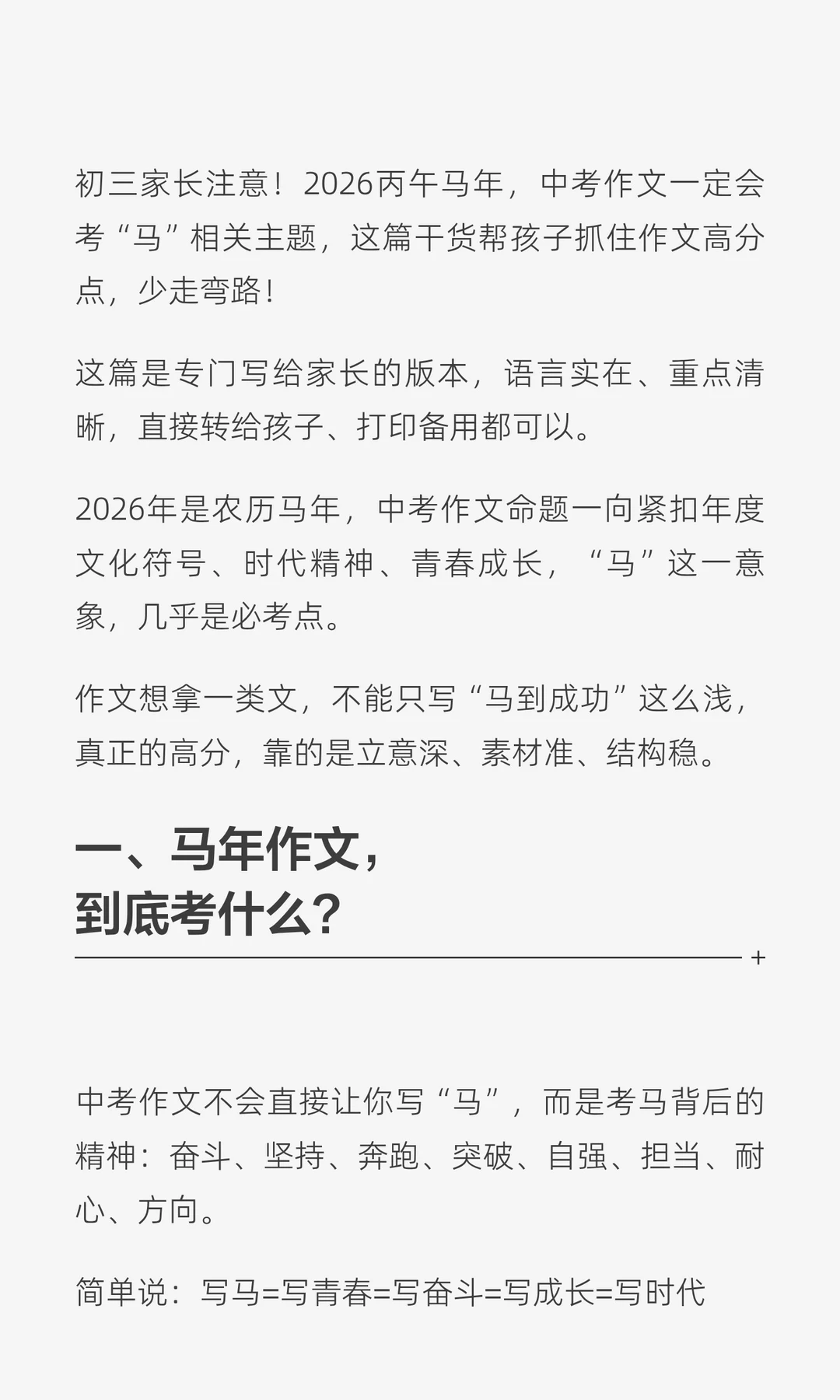 春晚背后藏着的中高考考点 🌸初三家长必读·帮孩子稳稳拿分! 🌸2026年是农历马年,中考作文命题一向紧扣年度文化符号、时代精神、青春成长,“马”这一意象,几乎是必考点。 🌸作文想拿一类文,不能只写“马到成功”这么浅,真正的高分,靠的是立意深、素材准、结构稳。 🌸上图图片家长可以直接讲给孩子听,也能陪着一起整理笔记。 🌸我是蜗牛老师,13年一线教学经验,致力于提升孩子语文成绩,会在平台持续分享初中语文学习干货和初中生成长规划。 🌸让我们一起努力,让孩子变得越来越好!