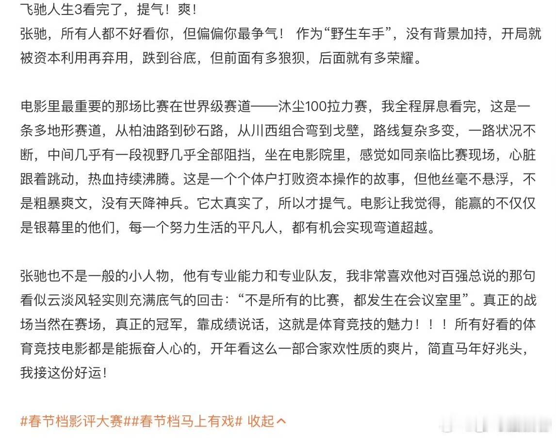 初中课本的子弹正中眉心真的被《飞驰人生3》狠狠共鸣了!初中熟背的诗句,从未想过会在影院里被戳中泪点。我们都曾面临两条路的选择,大多走了顺遂的坦途,而张驰选了人迹更少的那一条,为热爱孤注一掷,课本里的子弹,正中每个不甘平庸的我们。