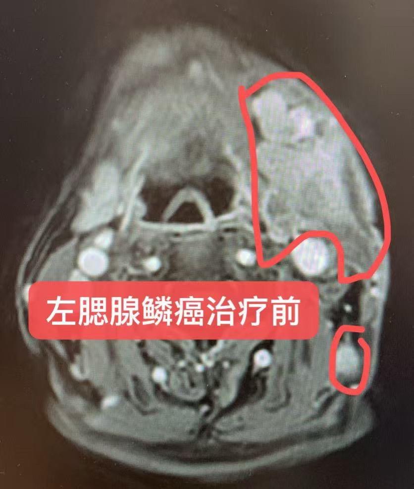 患者左腮腺低分化鳞癌(PD-L1 CPS=20)伴多发转移,一线免疫联合靶向