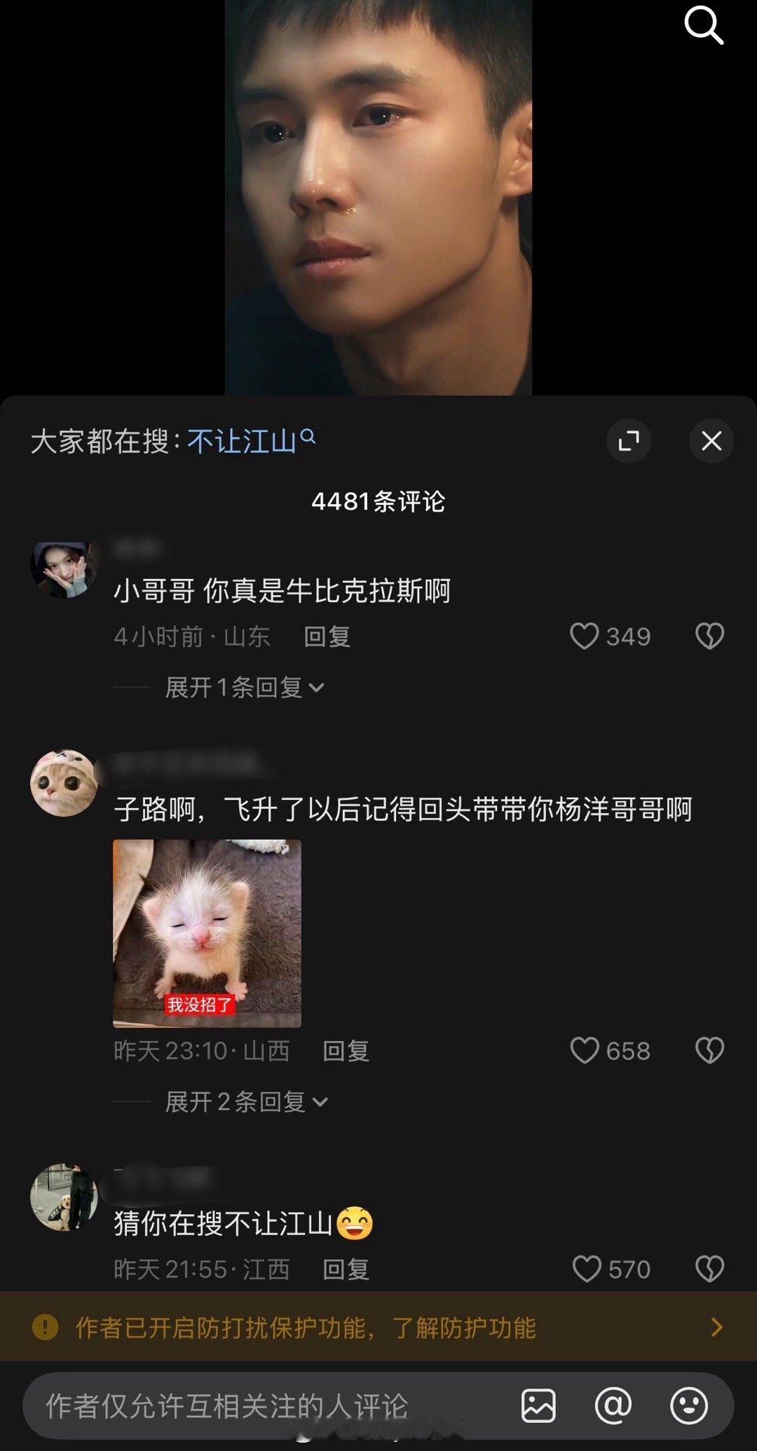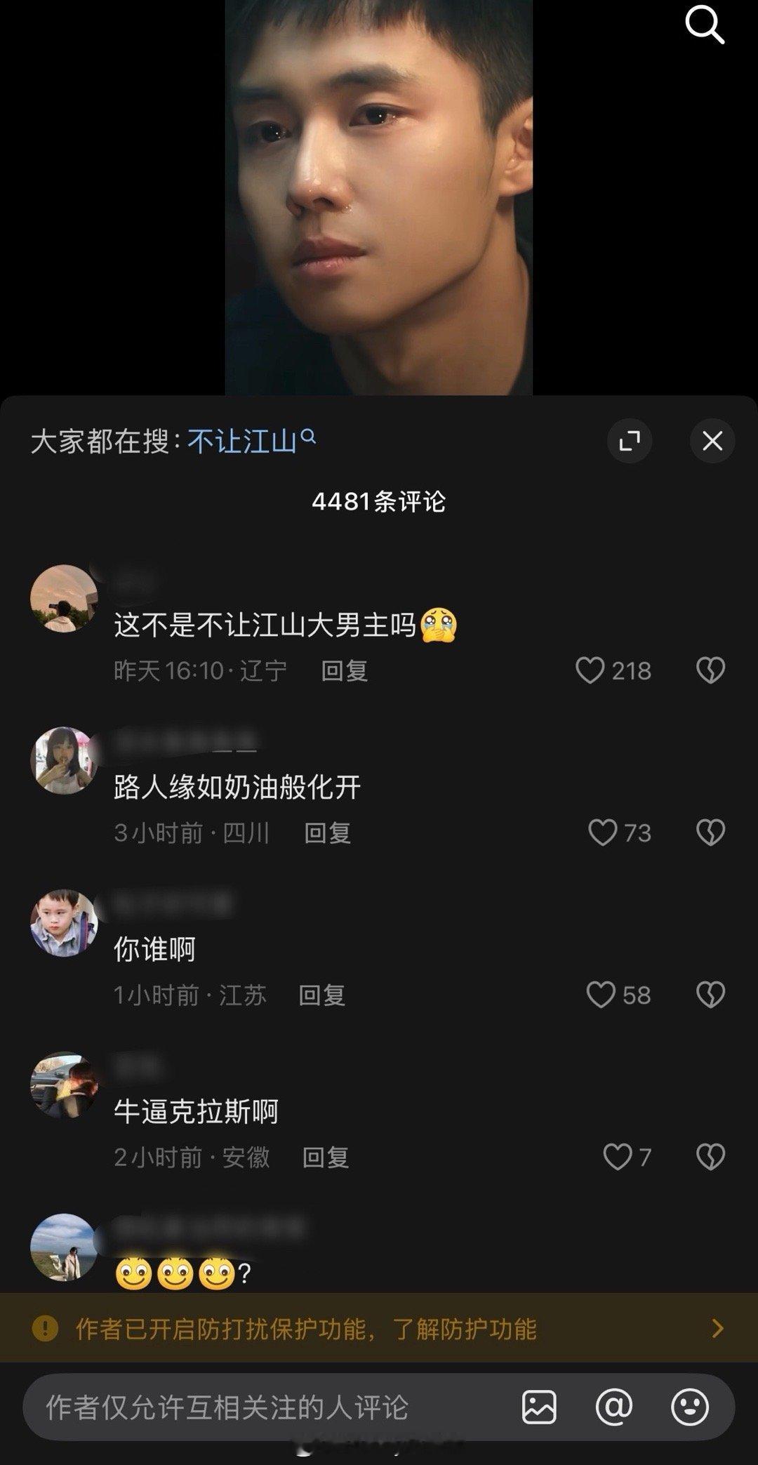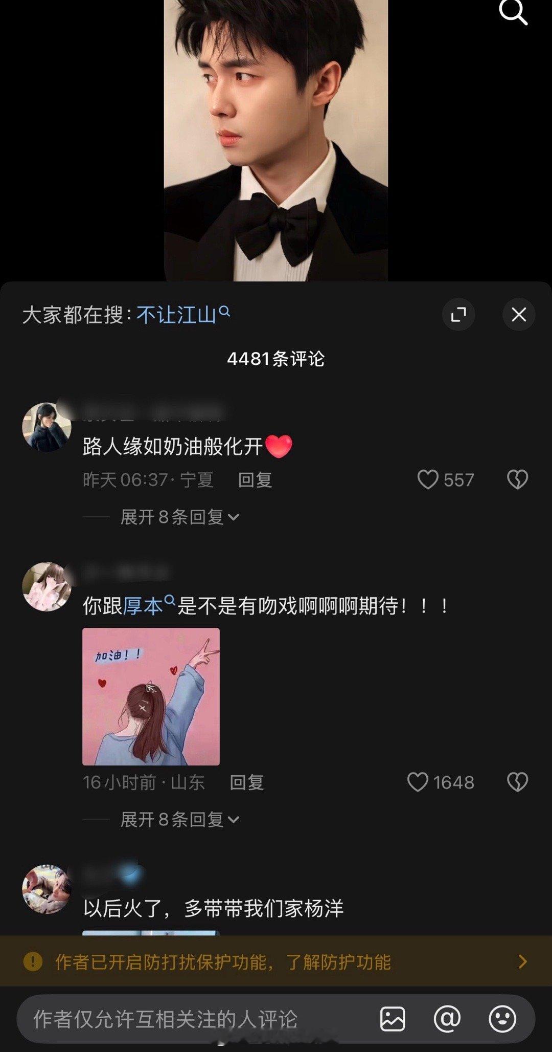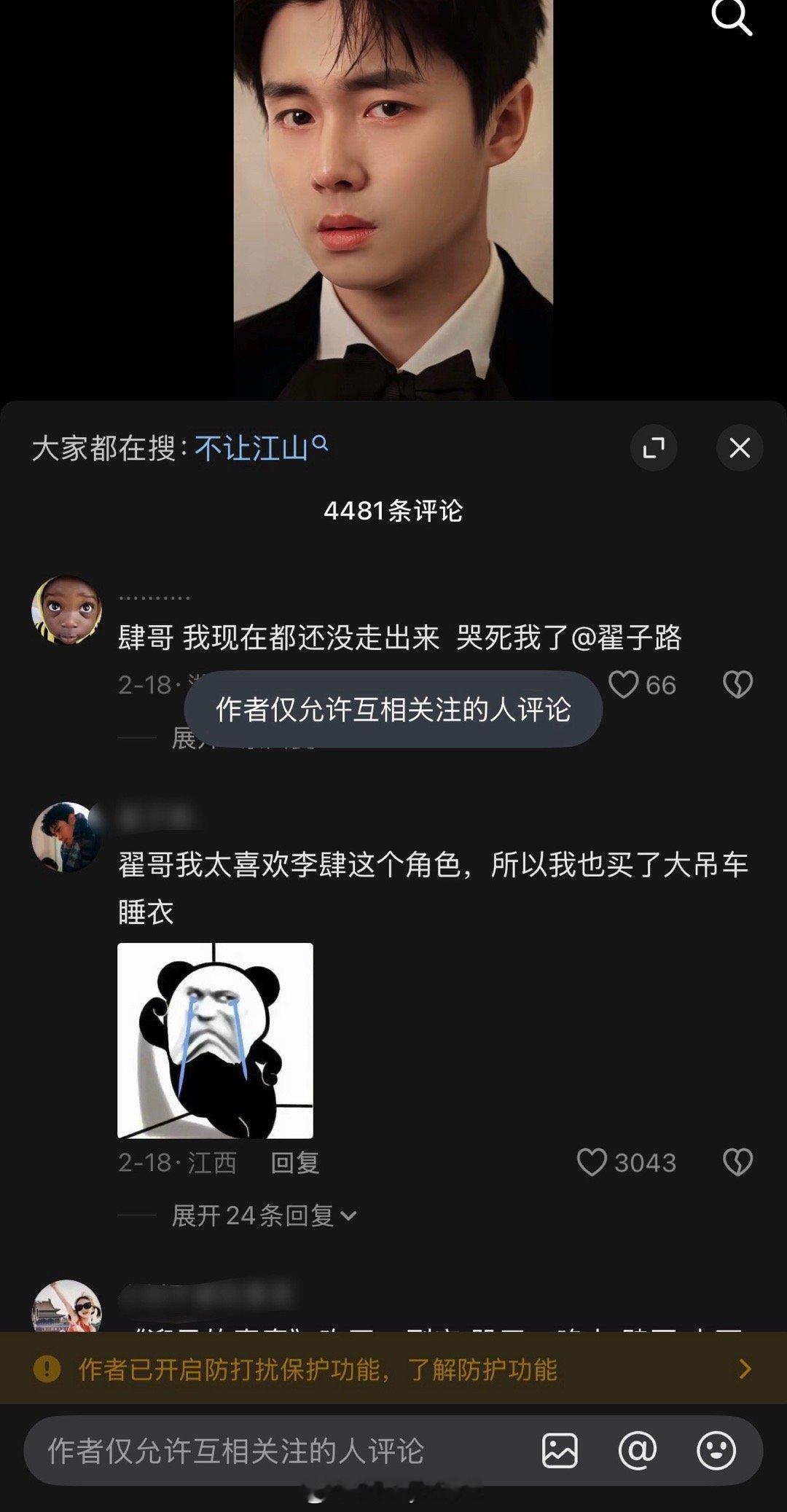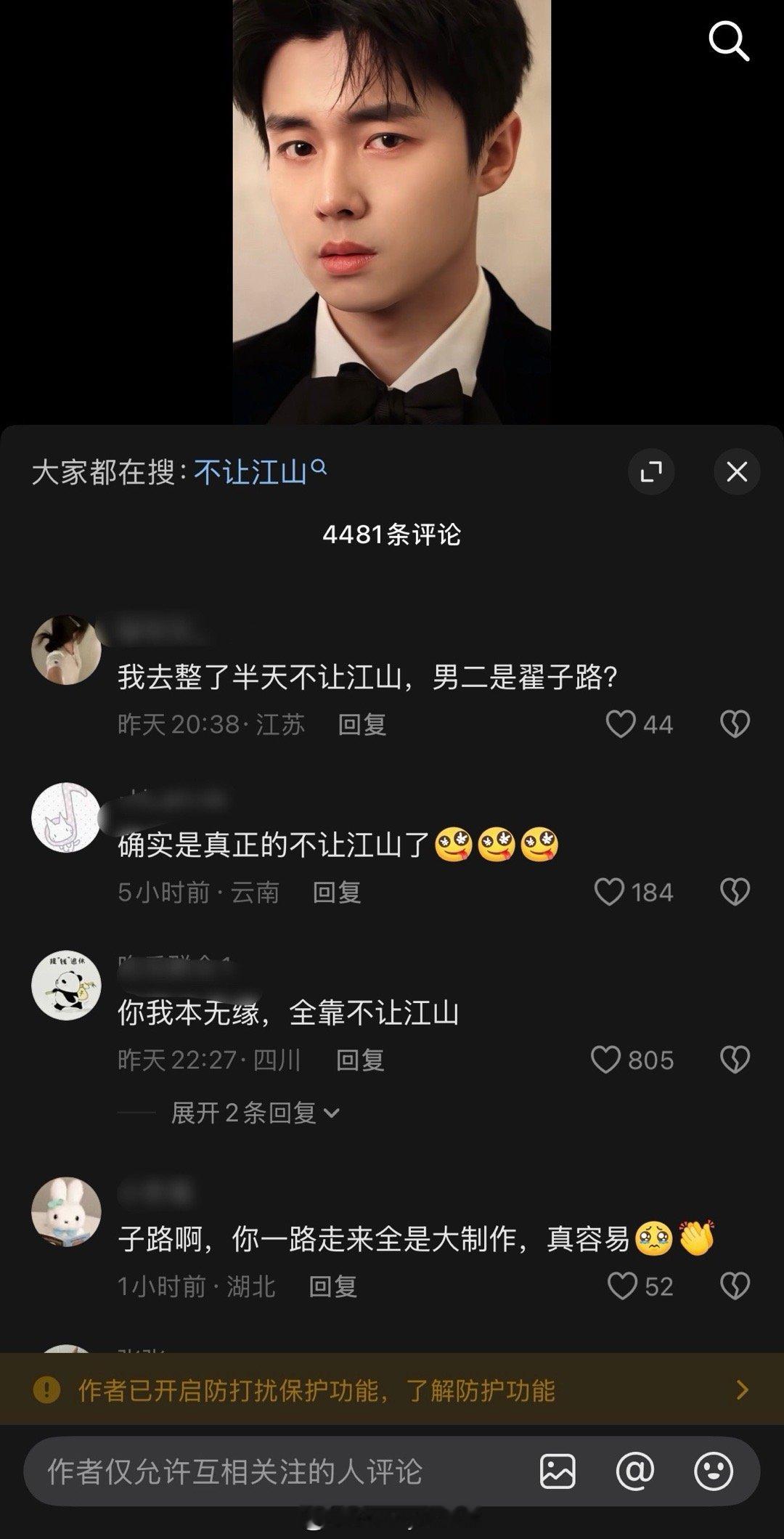 翟子路评论区被网友冲了,网友说他才是不让江山的大男主……目前翟子路评论区已经被关闭