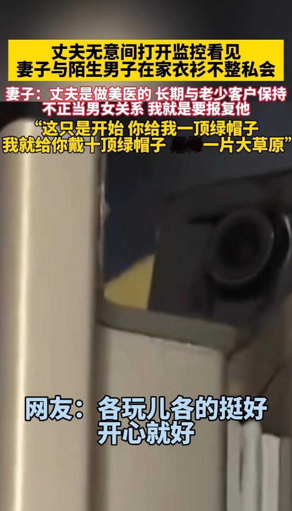 丈夫无意间打开监控看到妻子与陌生男子在家衣衫不整私会! 妻子:丈夫是做医美的,长期与老少客户保持不正当男女关系,我就是要报复他。 并称这只是开始,你给我戴一顶绿帽子,我会给你戴十顶绿帽子,还你一片大草原。 这夫妻俩都不是安分人,丈夫频繁出轨,妻子与陌生男子在家私会,毫不顾忌,真是大开眼界。 现实中有很多感情出轨的,有的良心发现选择回归家庭,有的则是一条道走到黑,非要闹得沸沸扬扬人尽皆知。 既然感情已断还不如早日脱身,还各自一个清净。
