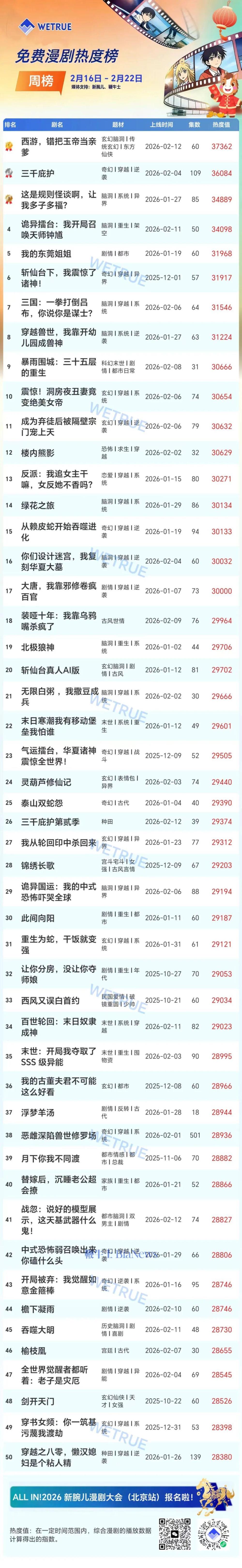 再看榜上漫剧的整体上线时间,少见为春节前夕上线的作品。不过,各家为春节档准备了很多AI短剧,而这些剧大概率都没有上榜。侧面印证出在免费漫剧语境下,春节档逻辑似乎并不成立。