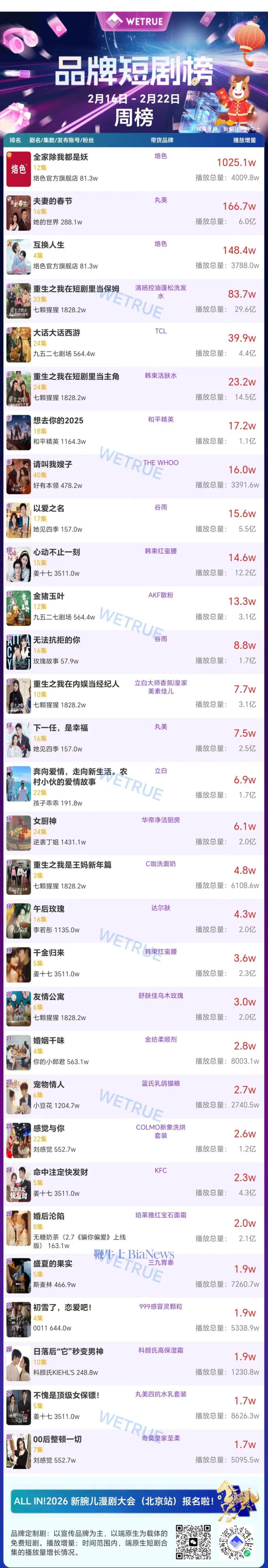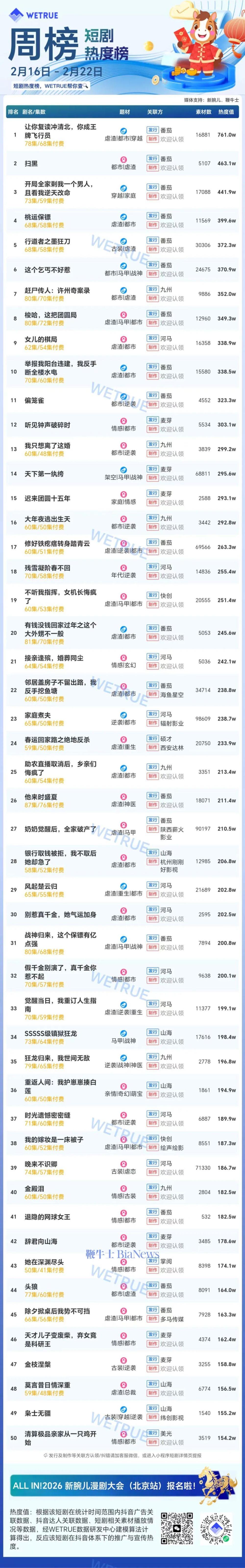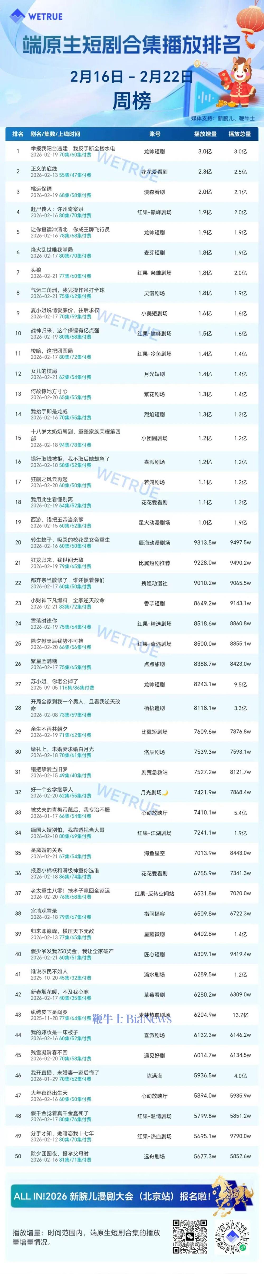 2月24日,新腕儿、鞭牛士联合WETRUE一点查剧共同推出2月第3周的短剧(付费、免费和端原生)&漫剧周榜、免费漫剧热度榜。这份2月16日-2月22日的数据情况,同样也是春节档最直观的表现。