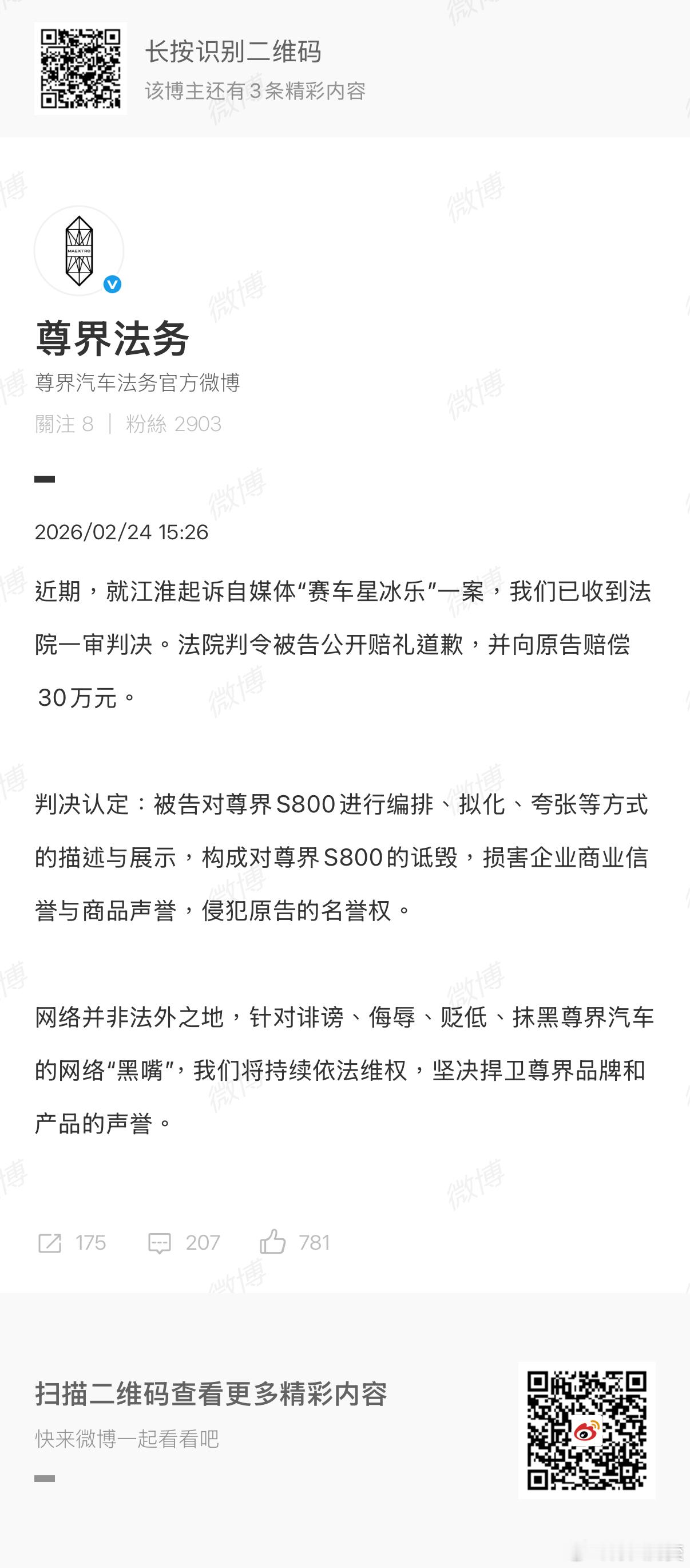 还有,我看今天尊界汽车那边也通报了一个案子,江淮起诉自媒体「赛车星冰乐」也拿到一审判决,赔了30万。