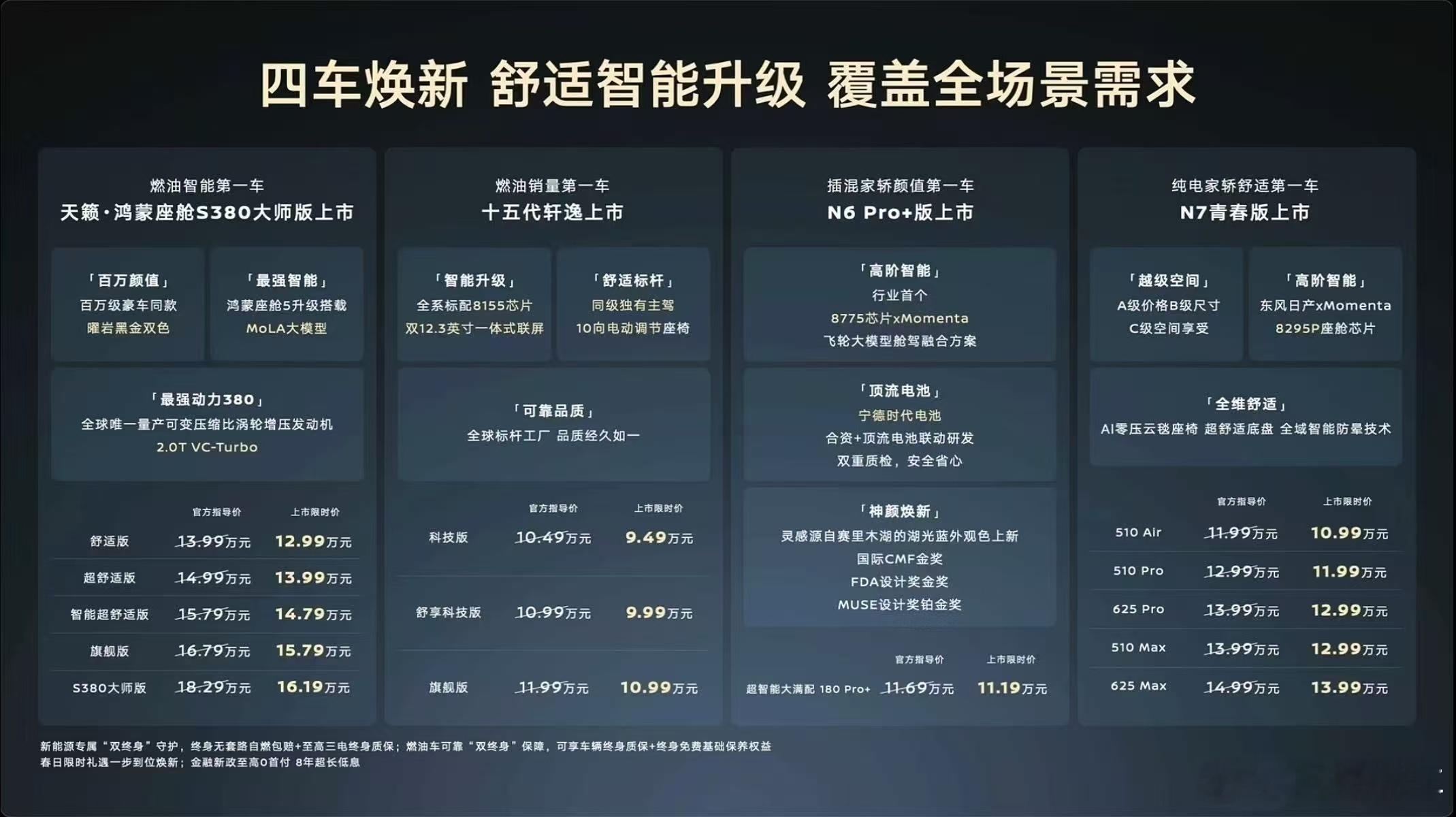 除了车辆本身的配置和颜值之外,还有服务兜底:新能源(N6/N7)——三电终身质保 + 终身无套路自燃包赔;燃油车(轩逸/天籁)——动力总成终身质保 + 终身免费保养。东风日产这波,是真的懂中国家庭了。东风日产开年王炸四连发