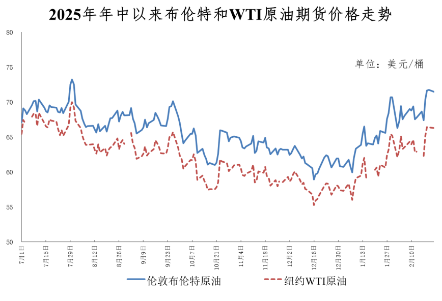 调价周期内,地缘政治风险上升主导国际油价震荡上行。一是美伊紧张局势骤然升级。伊朗在霍尔木兹海峡开展军事演习,一度关闭部分海域,而美方持续在中东地区增派军事力量,加剧市场恐慌情绪。二是俄乌会谈进展缓慢。俄乌在日内瓦举行的最新和平会谈仅持续两小时便结束,未取得任何突破性进展,相互军事打击仍在持续,和谈前景艰难且不确定。此外,美国冬季风暴导致原油产量下滑,加之美国原油库存超预期大幅下降,进一步提振油价。调价周期内,布伦特原油期货价格一度升至72美元,为2025年7月以来高位。