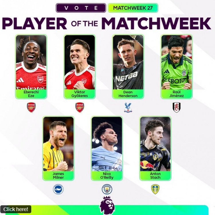 直播吧2月24日讯英超官方公布了本轮最佳球员候选名单,其中阿森纳两将埃泽、约克雷斯在列,具体如下: