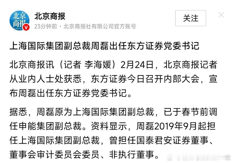 上海国际集团副总裁周磊出任东方证券党委书记。
