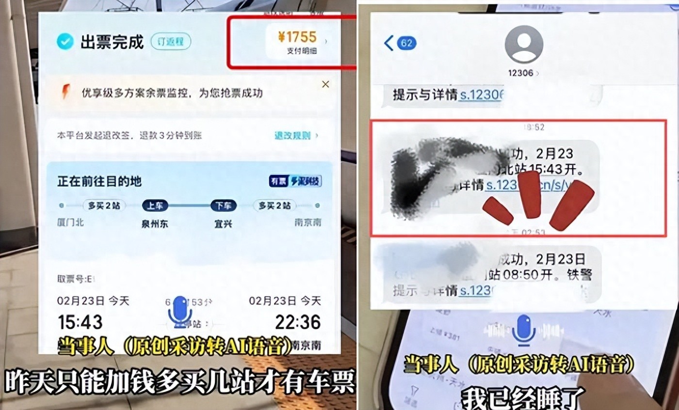 新黄河大鱼财经记者注意到,相关报道里,当事人提供了一张2月23日厦门北发车到南京南的候补出票成功截图,该订单显示发车时间为2月23日15时43分,支付价格为1755元;报道中还显示了当事人收到由12306发送的候补成功短信,分别为某日18时52分以及半夜2时53分发送。新黄河记者查询发现,12306在某日18时52分发送的候补成功短信匹配上述截图里的厦门北发车订单。