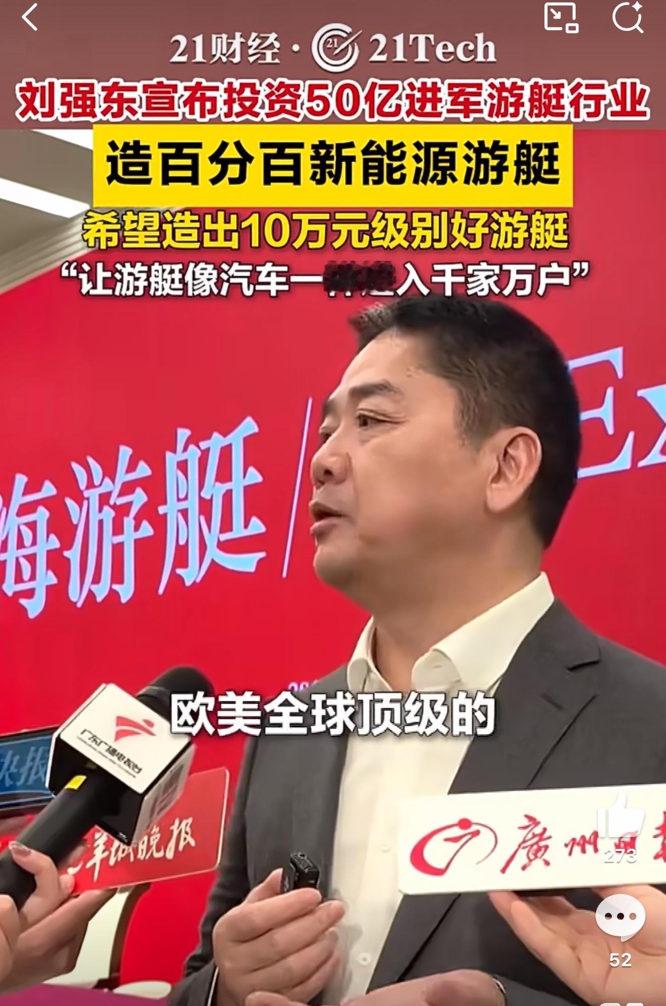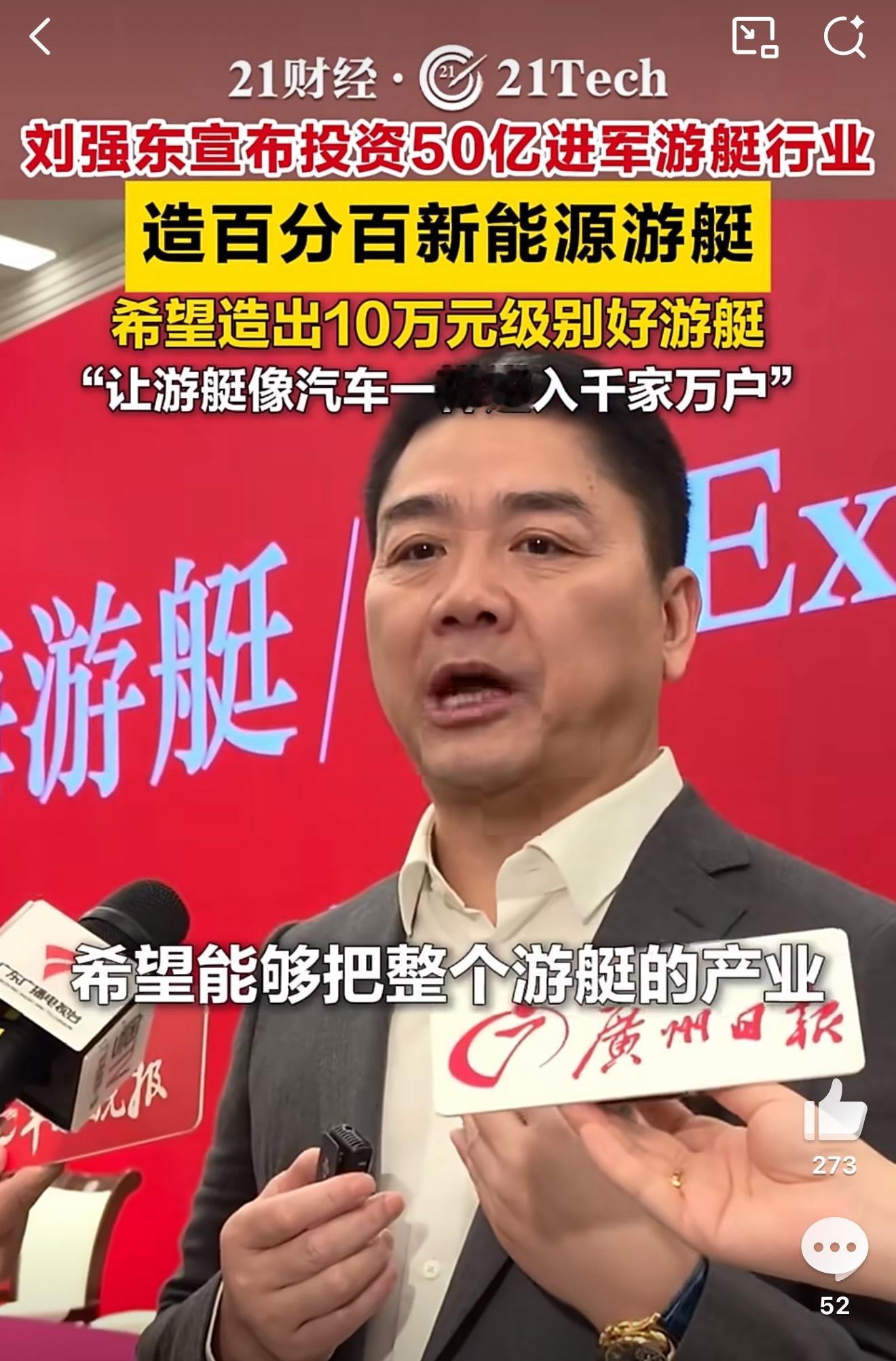 刘强东宣布进军游艇行业刘强东这次真是有点猛,直接砸50亿进军游艇行业,还要做10万块就能买的新能源游艇,让普通人都能用得起。要真能实现,这梦想挺炸的,感觉以后周末出海也能变成“标配休闲”。你敢想象自己划着京东游艇去看海吗?