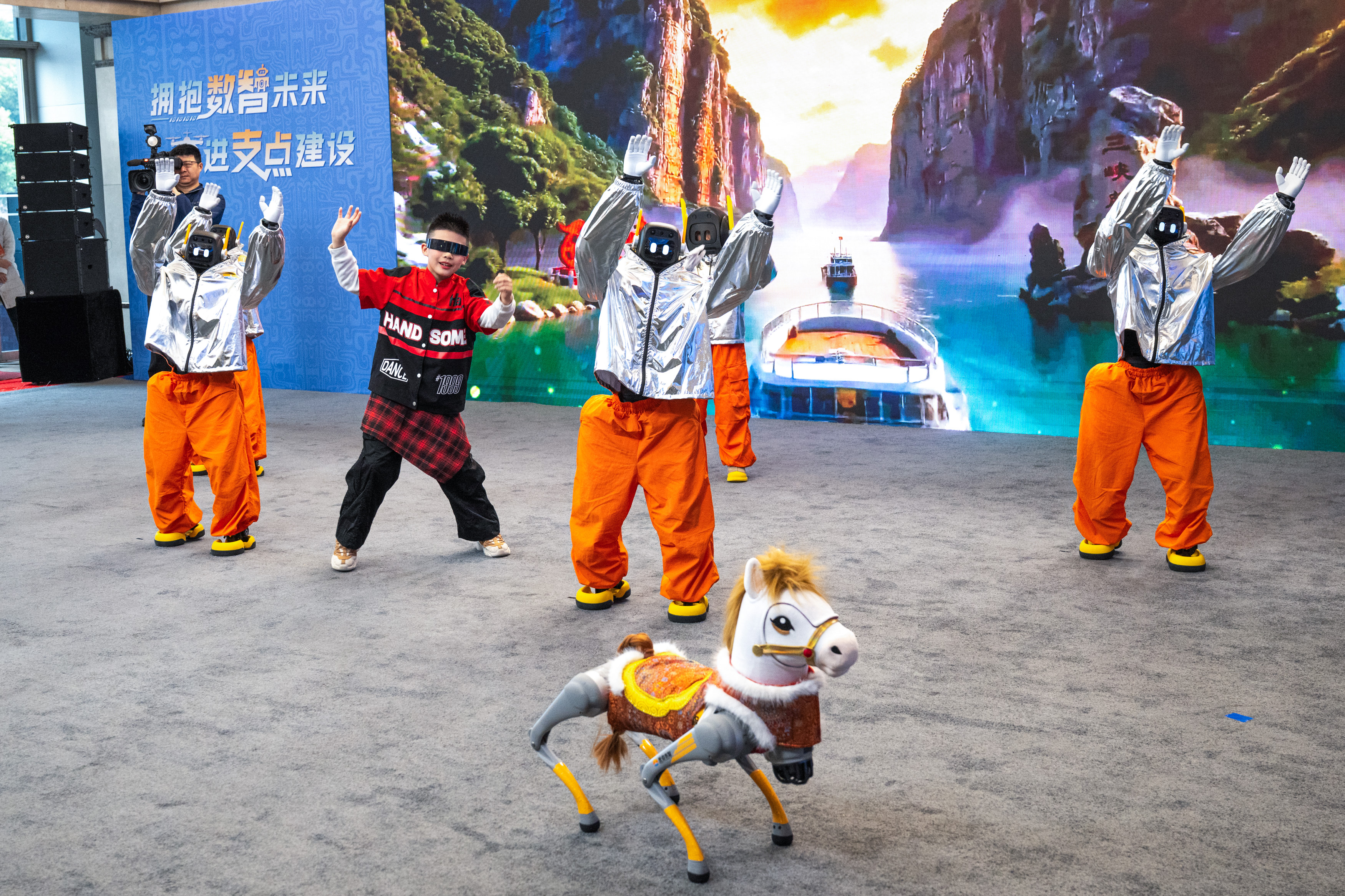 2月24日,小朋友与人形机器人在现场一起表演。新华社记者肖艺九摄