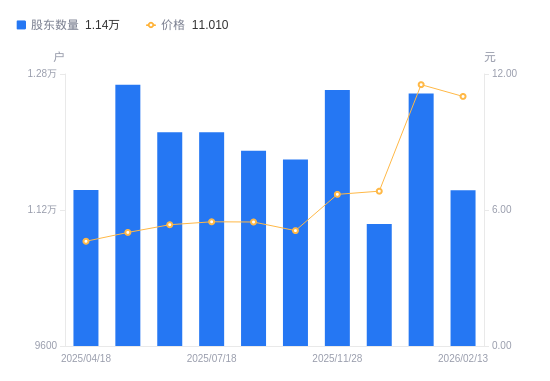 日期A股户数(户)流通A股户均持股数(股)户均持股市值(万元)2026-02-101257023123.5226.662026-01-091103626337.6817.992025-11-281261123048.3415.422025-09-301179424644.9612.542025-07-311189624433.6413.372025-07-181211623989.9813.152025-06-301211423993.9412.842025-05-301267522931.9611.492025-04-181143625416.4611.742025-04-101137825546.0211.29