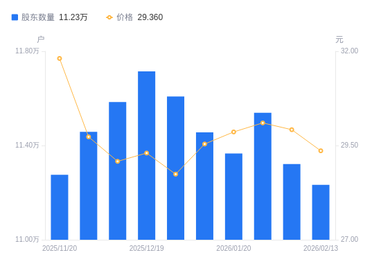 日期A股户数(户)流通A股户均持股数(股)户均持股市值(万元)2026-02-131123284830.9214.182026-02-101132164793.0214.342026-01-301153904702.7214.162026-01-201136654774.0914.262026-01-091145564736.9613.992025-12-311160784674.8513.442025-12-191171454632.2713.572025-12-101158474684.1713.622025-11-281145794736.0114.082025-11-201127544812.6615.31