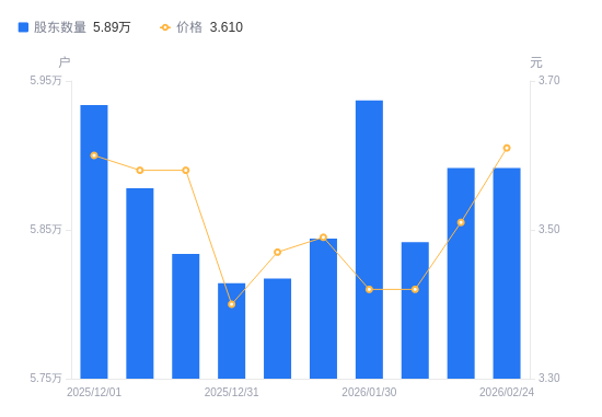 日期A股户数(户)流通A股户均持股数(股)户均持股市值(万元)2026-02-135891565963.8623.152026-02-105841866525.0622.752026-01-305937065458.3322.392026-01-205844266497.7423.212026-01-105817266806.3923.182025-12-315814266840.8622.732025-12-205833966615.1523.852025-12-105878066115.3623.672025-12-015933965492.5323.582025-11-216034864397.5123.25
