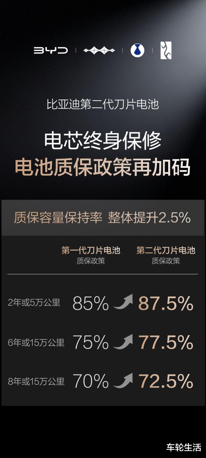 关于长寿命问题。比亚迪通过打造“锂离子高速通道”和“全温域智能热管理系统”,让闪充尽量少产热,而且让热量更快、更均匀地散出去,让闪充既充得快,又很耐用。口说无凭,比亚迪可是给了实打实的承诺,在电池质保上,第二代刀片电池质保的“容量保持率”整体提升2.5%,电池容量低于77.5%就免费包换,电芯依旧是“终身保修”。这样的承诺显然是比亚迪对第二代刀片电池长寿命的自信。