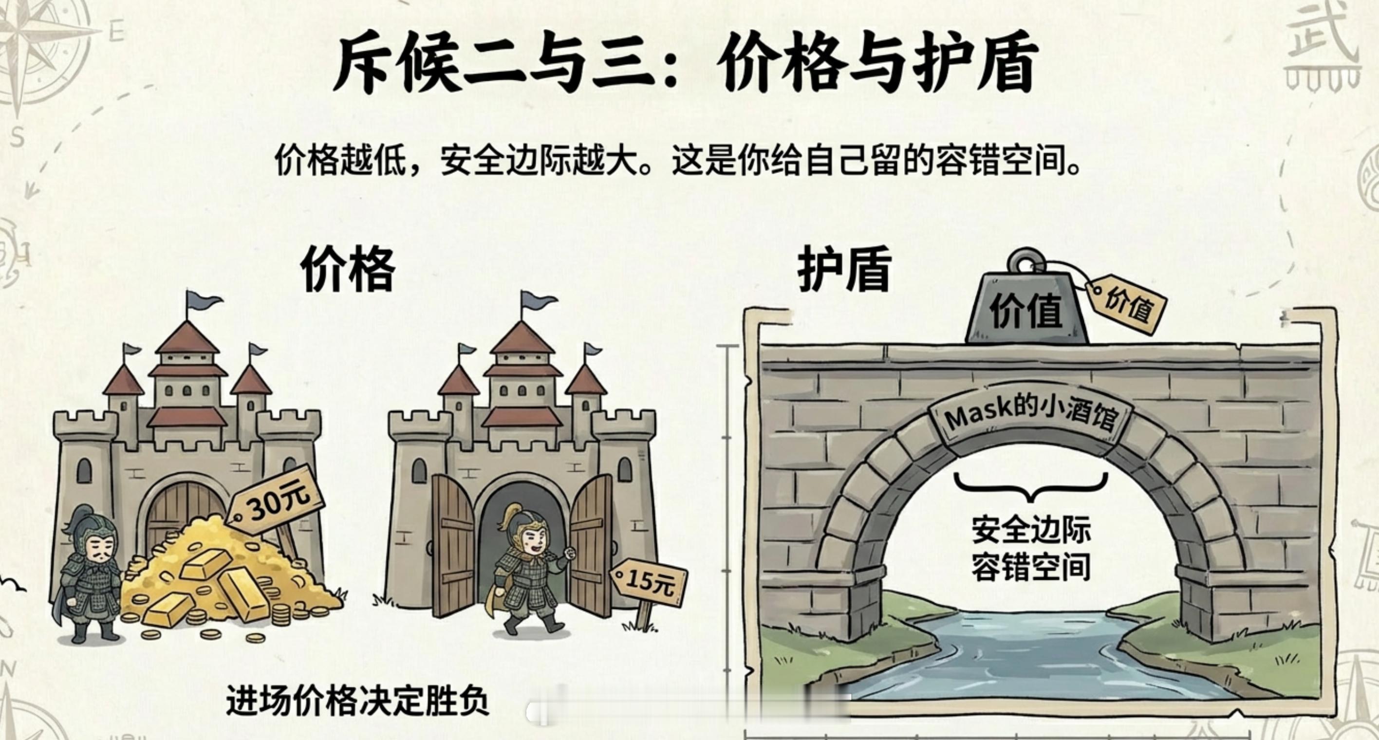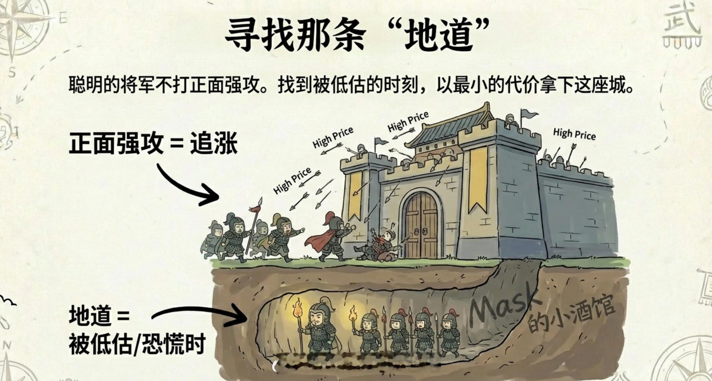 三、你的钱是士兵,你是统帅说到这里,我给你打个比方,你马上就懂了。你账户里的钱,就是你的士兵。你是三军统帅。现在你要去攻打一座城堡。一个聪明的将军,不会一上来就正面强攻,因为那样伤亡最大。他会先侦察地形,找到城堡的薄弱点,找到一条地道,然后以最小的代价,拿下这座城。投资也是一样。这座城堡,就是你想买的那家公司。正面强攻,就是在价格高位、大家都在追捧的时候冲进去买。地道,就是价格低位——当市场恐慌、价格被低估的时候,悄悄买入。找到那条地道,才能以最小的代价打赢这场仗。