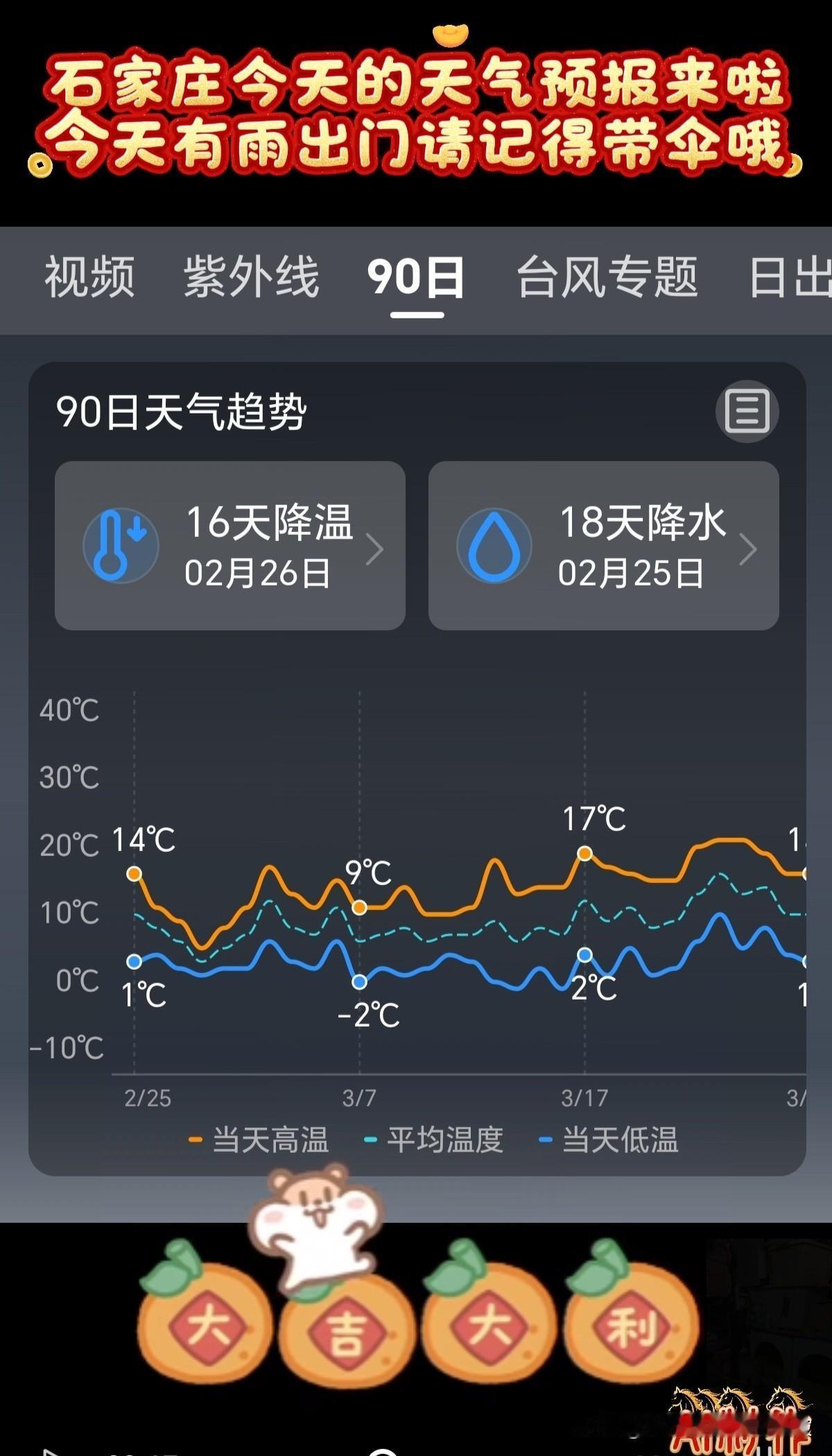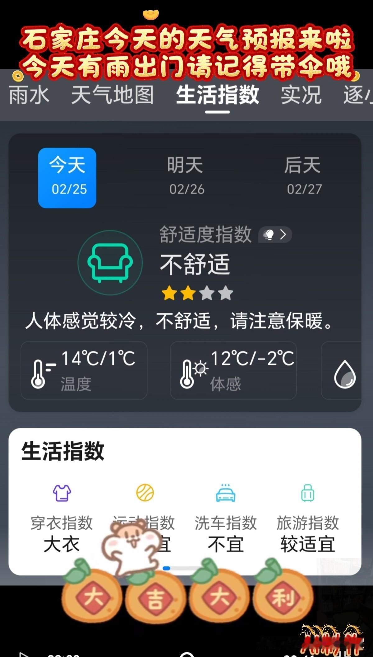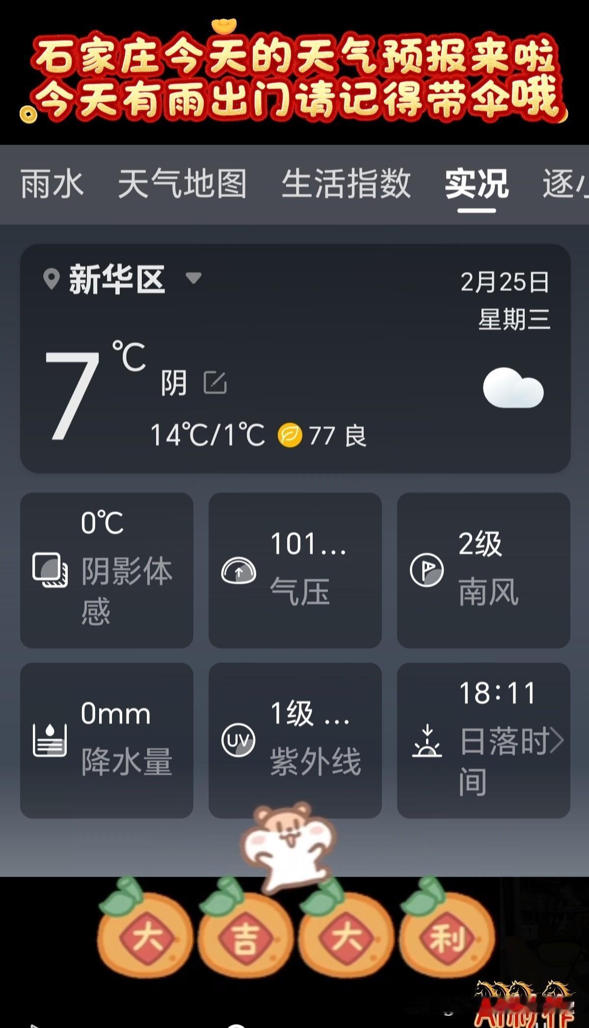 🌻早安问候🌻 𝙂𝙤𝙤𝙙 𝙈𝙤𝙧𝙣𝙞𝙣𝙜 今天是: 2026年2月25日 星期三 农历:丙午年正月初九 今天有小雨,出门记得带伞! 签到成功,获得26个创业卷,已连续签到25天 👉石家庄今日天气: 多云转小雨,出门请带伞 👉空气质量:良 除少数对某些污染物特别容易过敏的人群外,其他人群可以正常进行室外活动空气质量 👉气温:14℃~1℃ 今天昼夜温差13度,人体感觉较冷,不舒适,请注意防寒保暖 👉湿度:70% 👉风向:西南风转北风 👉风力:3级 👉紫外线:1级,最弱紫外线辐射天气,无需特别防护。若长期在户外,建议涂擦SPF在8-12之间的防晒护肤品 👉日出:07:00 👉日落:18:11 ꧁ 🍄꧂ 🌷🌴🍒 送上真诚的祝福,愿快乐与你相伴,愿幸福与你相牵!时间在变,心意不变,无论我们相隔多远,我都祝你幸福好运在身边,一切顺利平安! ʚ🌻ɞ早安吉祥☕️