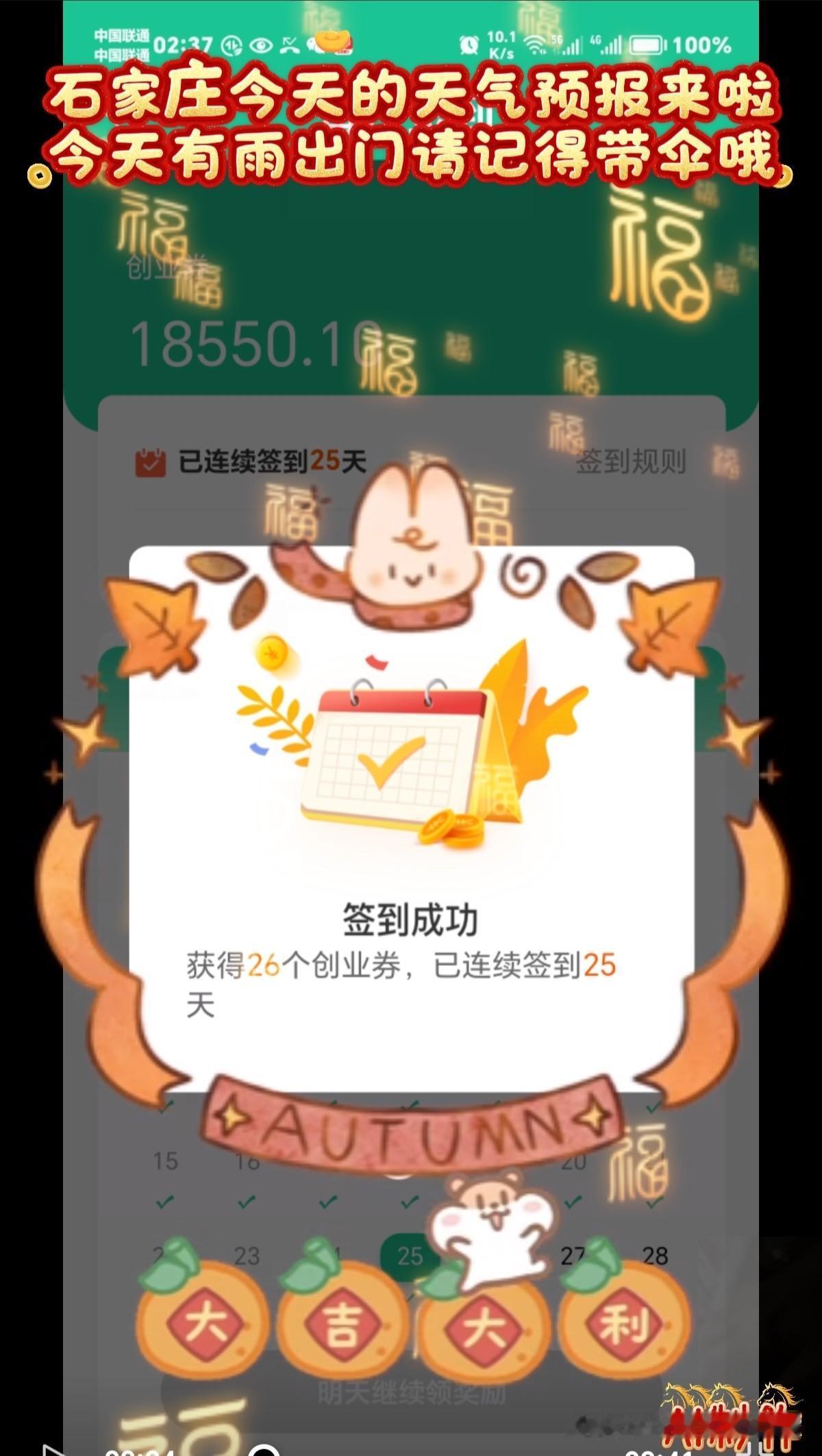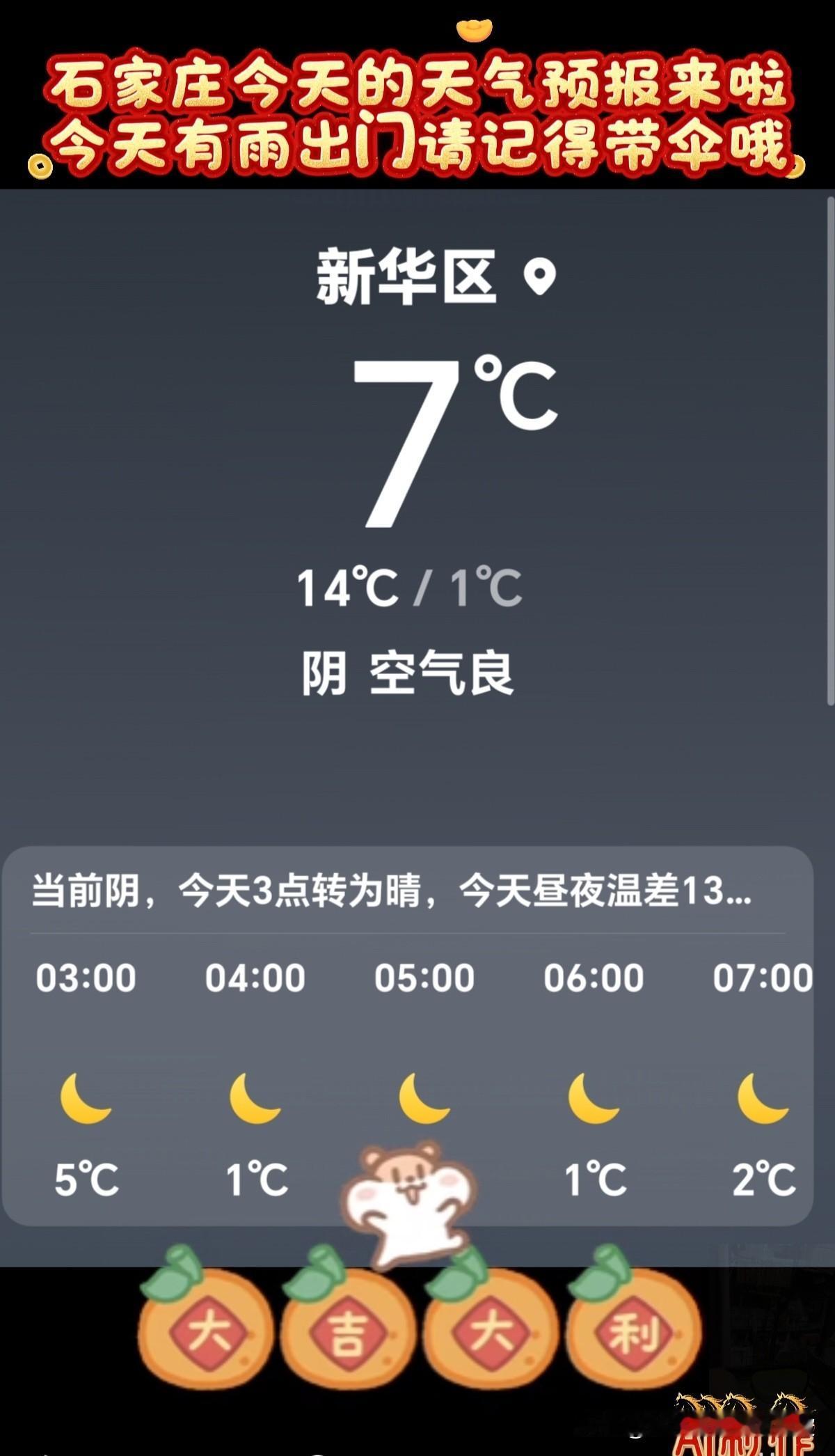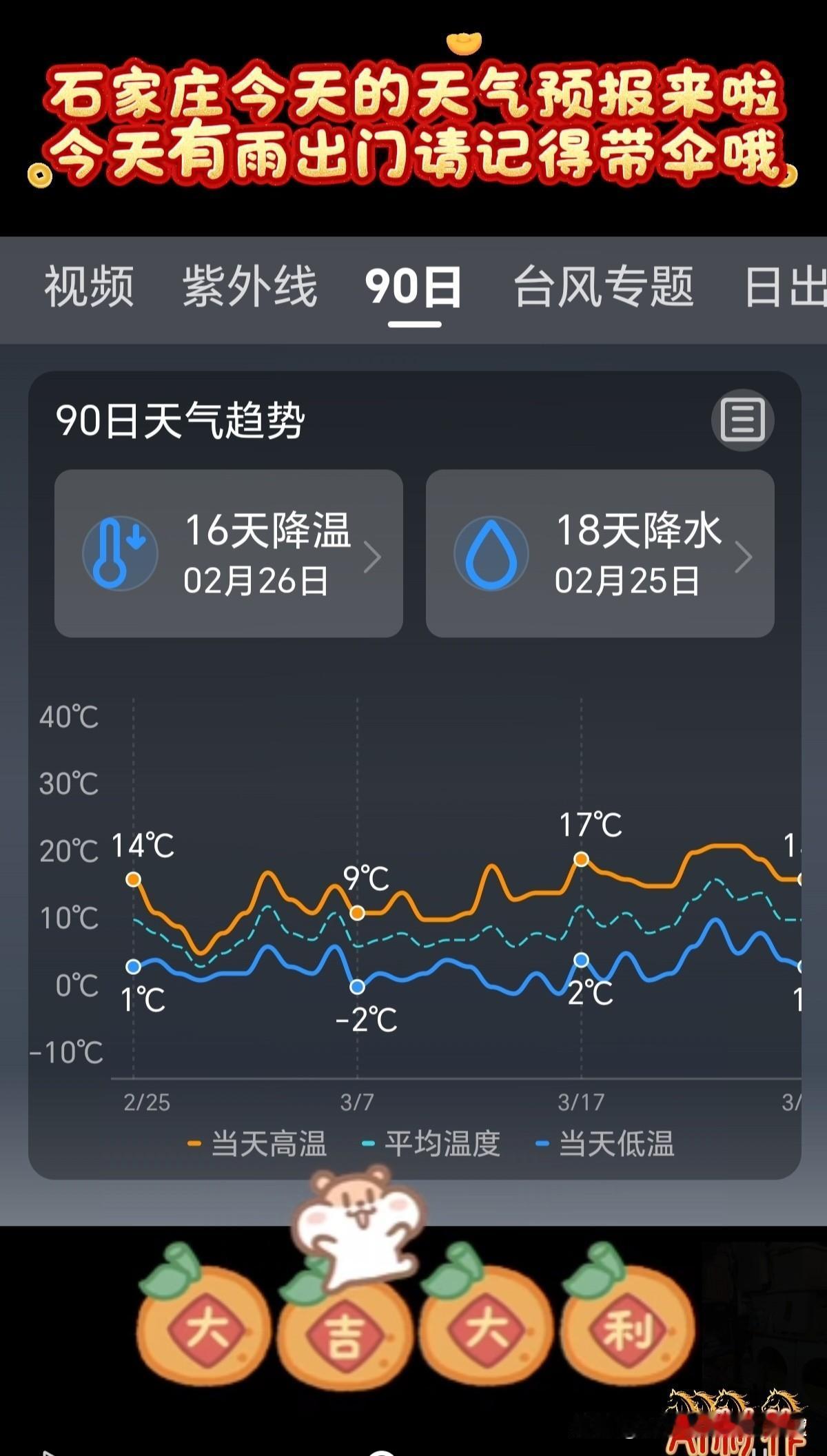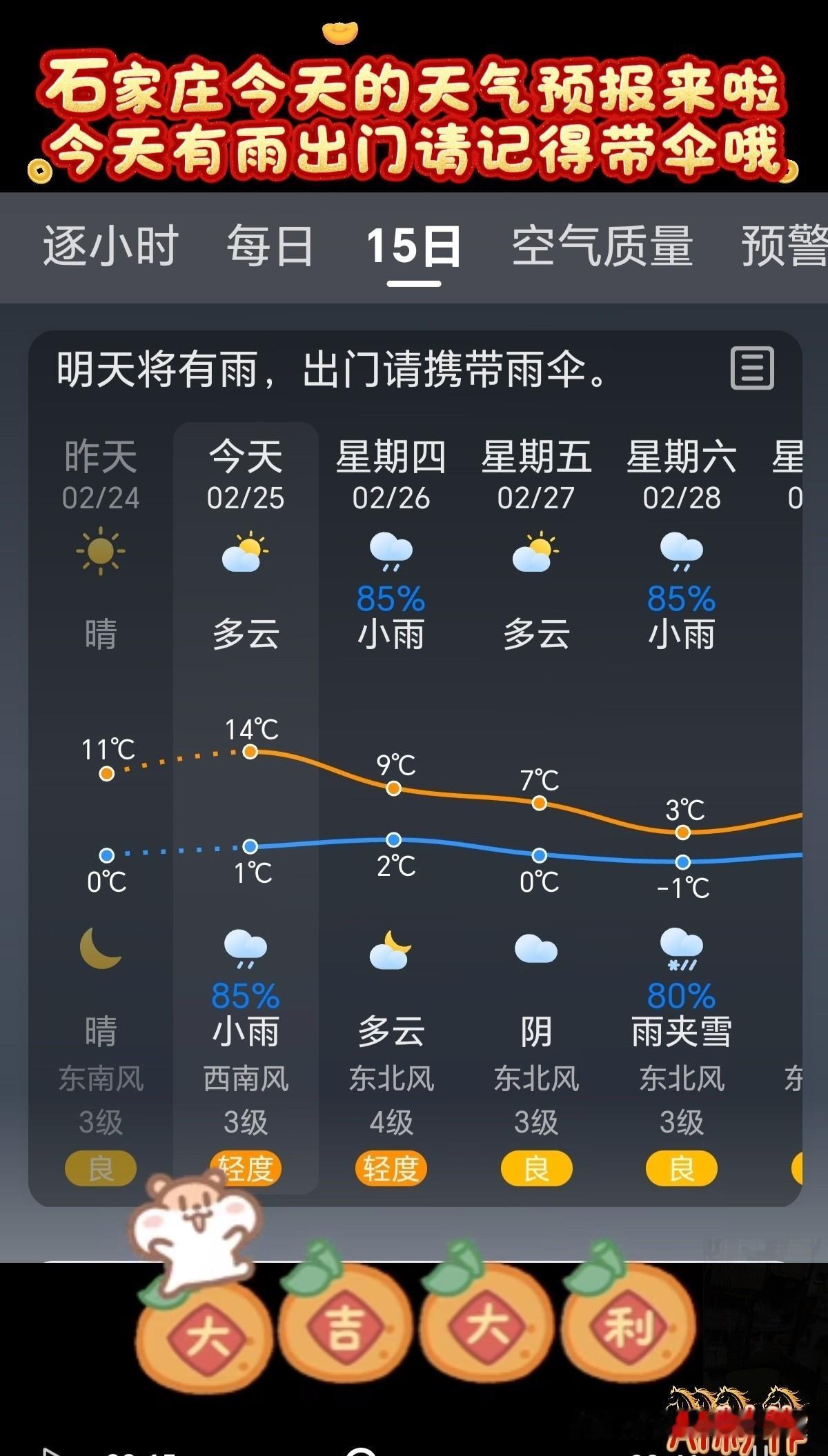 🌻早安问候🌻 𝙂𝙤𝙤𝙙 𝙈𝙤𝙧𝙣𝙞𝙣𝙜 今天是: 2026年2月25日 星期三 农历:丙午年正月初九 今天有小雨,出门记得带伞! 签到成功,获得26个创业卷,已连续签到25天 👉石家庄今日天气: 多云转小雨,出门请带伞 👉空气质量:良 除少数对某些污染物特别容易过敏的人群外,其他人群可以正常进行室外活动空气质量 👉气温:14℃~1℃ 今天昼夜温差13度,人体感觉较冷,不舒适,请注意防寒保暖 👉湿度:70% 👉风向:西南风转北风 👉风力:3级 👉紫外线:1级,最弱紫外线辐射天气,无需特别防护。若长期在户外,建议涂擦SPF在8-12之间的防晒护肤品 👉日出:07:00 👉日落:18:11 ꧁ 🍄꧂ 🌷🌴🍒 送上真诚的祝福,愿快乐与你相伴,愿幸福与你相牵!时间在变,心意不变,无论我们相隔多远,我都祝你幸福好运在身边,一切顺利平安! ʚ🌻ɞ早安吉祥☕️