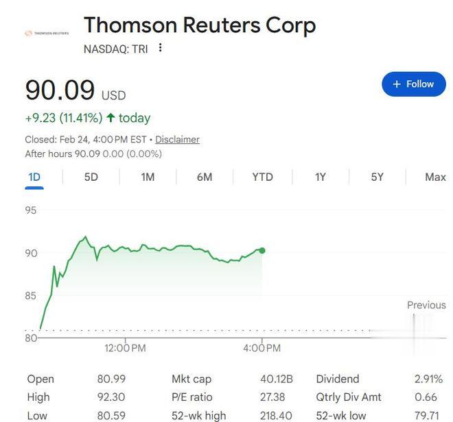 到收盘,汤森路透涨11.4%,FactSet涨5.9%,DocuSign和LegalZoom涨约2.6%。
