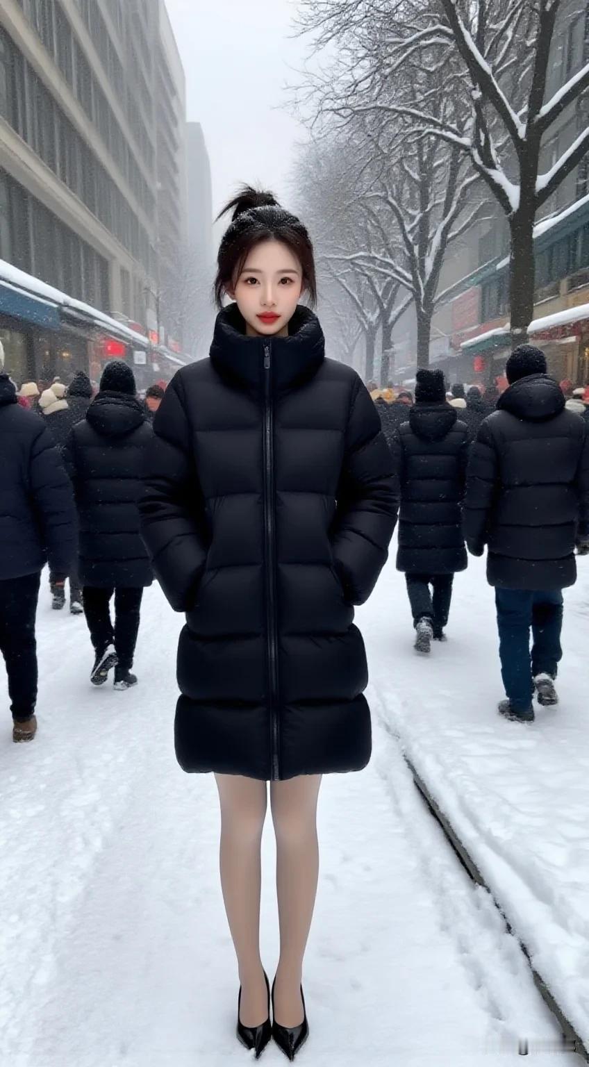 冬日雪景中的时尚穿搭,黑色羽绒服搭配高跟鞋,温暖又时髦!