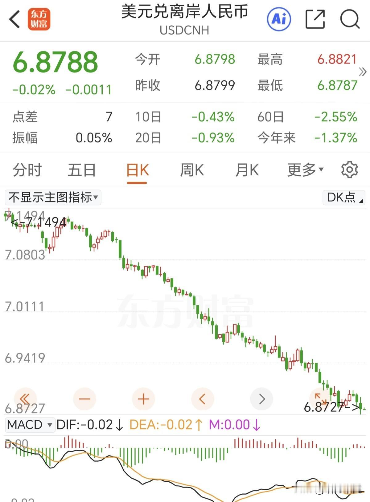 能不能一鼓作气突破4140点! 昨夜美股全线上涨,纳斯达克中国金龙指数也是反包,外部条件是偏利好的。这样的条件下,上证指数如果不能突破下降趋势线,就说明趋势很弱,要等二次回踩。 另一个实打实的利好就是人民币汇率升破6.87,现在汇率走单边调整趋势,一时间还没有反弹,这样的条件支撑股市的震荡上行啊,主力应该把握这样的时间窗口。 俗话说得好,一鼓作气,再而衰,三而竭。就看权重板块能不能发力突破吧,上证50有进一步震荡冲高的动力[祈祷][祈祷]